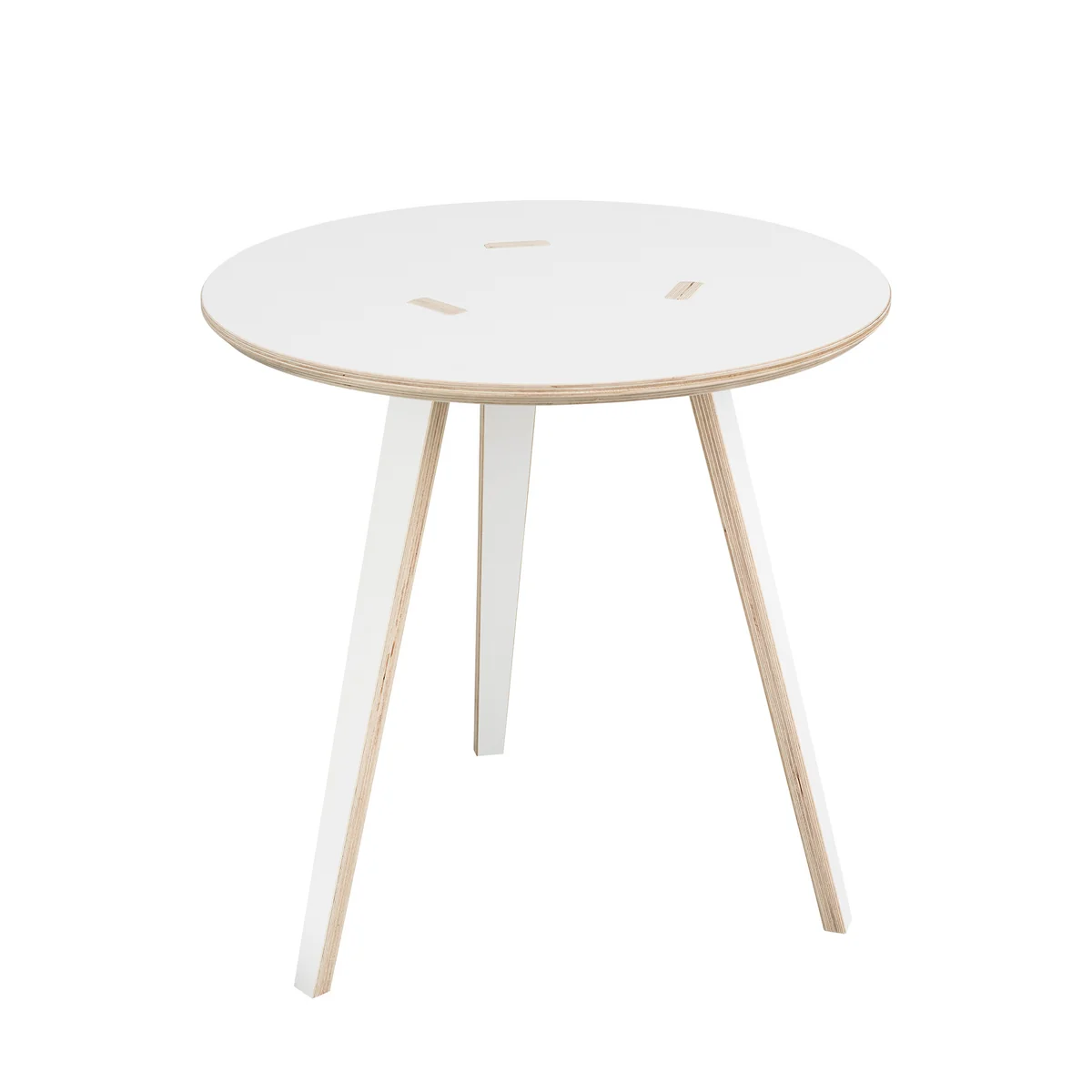 Der rund Beistelltisch von Tojo besteht jeweils aus fünf Teilen: einer Tischplatte, drei Beinen und einem Spannelement. Im zerlegten Zustand ist sein Packmass gering und kompakt, wodurch der Tisch flexibel und platzsparend ist. Die nötige Stabilität ergibt sich durch das Prinzip des Verspannens. Die Beine werden in die aus der Tischplatte gefrästen Löcher eingesetzt, das Spannelement greift durch eindrehen in die Nut, fixiert die Beine und drückt diese gleichzeitig nach aussen. Dadurch ist der Tisch nicht nur praktisch sondern auch dekorativ.