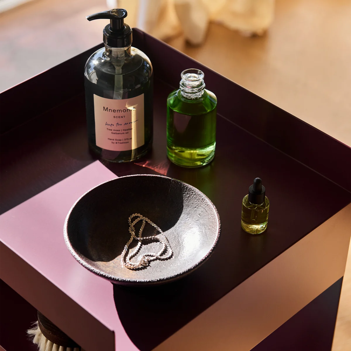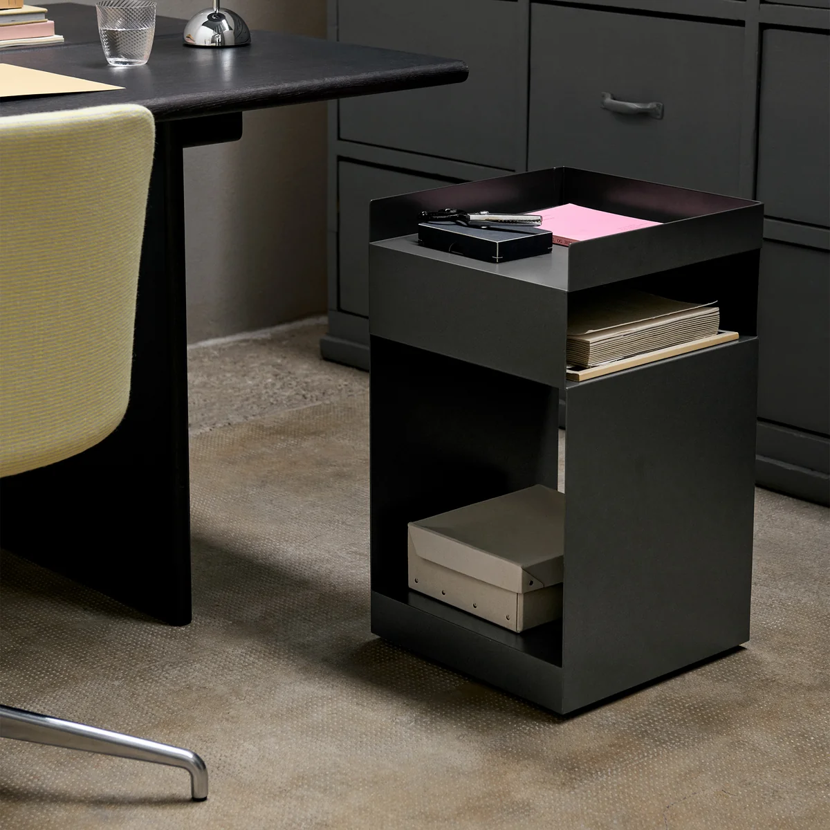 Der Rotate SC73 Beistelltisch des dänischen Herstellers &Tradition scheint auf den ersten Blick recht schlicht zu sein, doch täuscht dies über sein funktionales Design hinweg. Der asymmetrische Beistelltisch lässt sich für eine Vielzahl von Zwecken einsetzen - vom Bürowagen bis hin zur Ablage im Badezimmer oder ganz klassisch als Nachttisch im Schlafzimmer; Rotate kann in jedem Wohnraum integriert werden. Er wird aus einem Stück Blech gefertigt, welches in zwei Teile geschnitten, gebogen und anschliessend zusammengeschweisst wird. Die Räder des Beistelltisch ermöglichen simples Manövrieren.