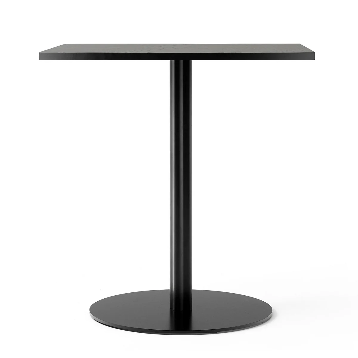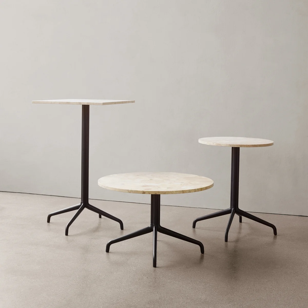 Die Tischplatte besteht aus einfachen geometrischen Formen und ist in einer runden sowie einer eckigen Variante erhältlich. Die Auswahl verschiedener Oberflächen kann bestens dem eigenen Geschmack angepasst werden. Als Basis dient ein Säulenelement aus pulverbeschichtetem Stahl mit rundem Standfuss. Es sorgt für Stabilität, zeichnet sich jedoch gleichzeitig durch seine schlanke Silhouette aus.