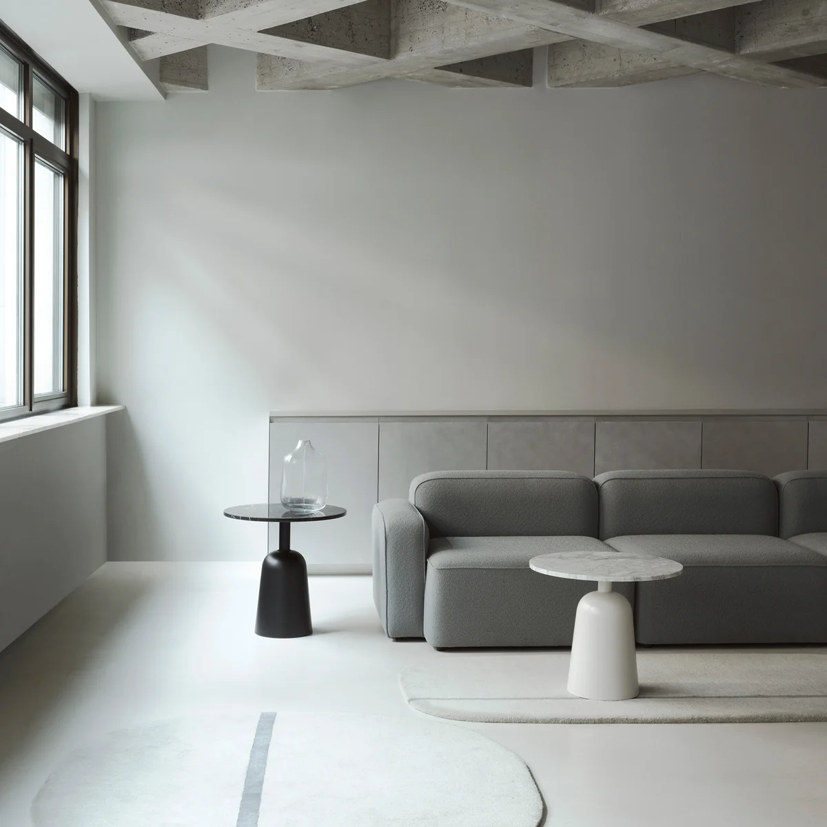 Der Turn Couchtisch von Simon Legald für Normann Copenhagen ist ein kleiner, aber hoch funktionaler Tisch aus Holz und Stahl. Der Name Turn bezieht sich auf die Drehbewegung, mit der die Höhe der runden Tischplatte angepasst werden kann. Mühelos erhebt sich diese von ihrer glockenförmigen Stahlbasis in die Höhe und erweitert den Tisch von 41,5 cm auf 66,5 cm.