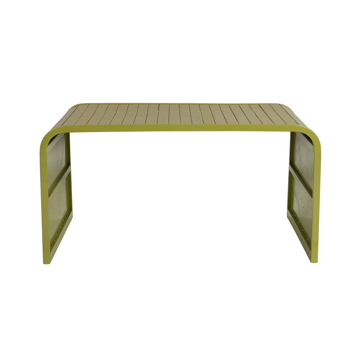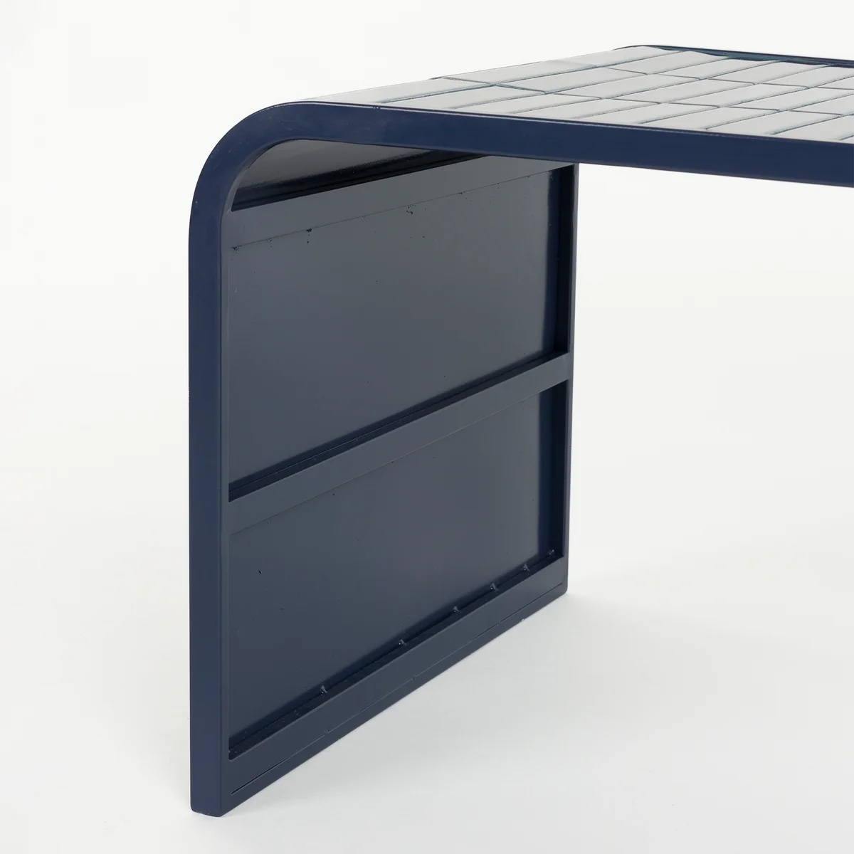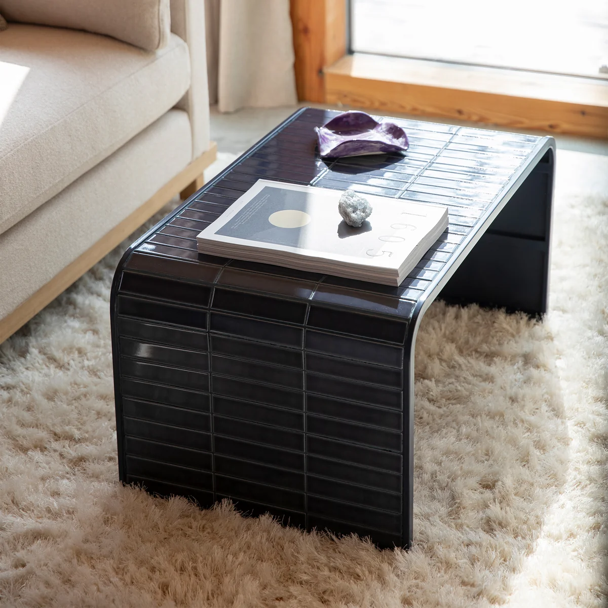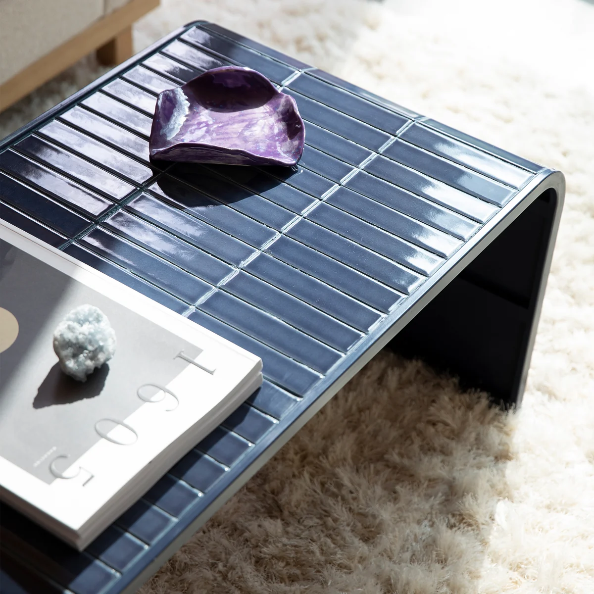 Der Tiles Couchtisch bringt Bewegung ins Spiel. Seine geschwungene Form schmiegt sich elegant zwischen Sofa-Elemente und wirkt wie ein fliessendes Bindeglied im Raum. Doch was ihn wirklich zum Statement macht, ist seine Oberfläche: glänzend lackierte, längliche Fliesen, die in kräftigen Farben leuchten und bei Lichteinfall für eindrucksvolle Reflexe sorgen. Die Kombination aus dem kachelartigen Finish und dem klaren Metallgestell verleiht dem Tisch eine fast skulpturale Präsenz – verspielt und gleichzeitig strukturiert.