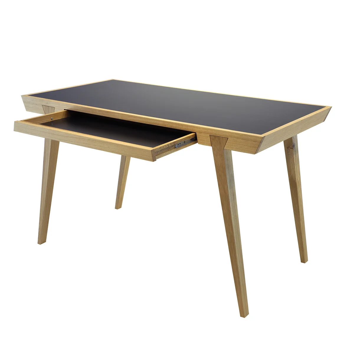 Der Desk Schreibtisch von Jan Kurtz kann unglaublich vielseitig eingesetzt werden! Ob als Esstisch, Schreibtisch oder gar als Konsole - der Desk Tisch ist ein absolutes Designerstück. Der Rahmen des Tisches wird aus massiver, geölter Eiche gefertigt. Die Trägerplatte besteht aus schwarzem Linoleum. Der Desk von Jan Kurtz verfügt ausserdem über eine Schublade an der Unterseite der Tischplatte - Hier können Unterlagen mühelos verstaut werden. Mit seiner Einfachheit und seinen klaren Linien passt er sich jedem Wohnambiente an.