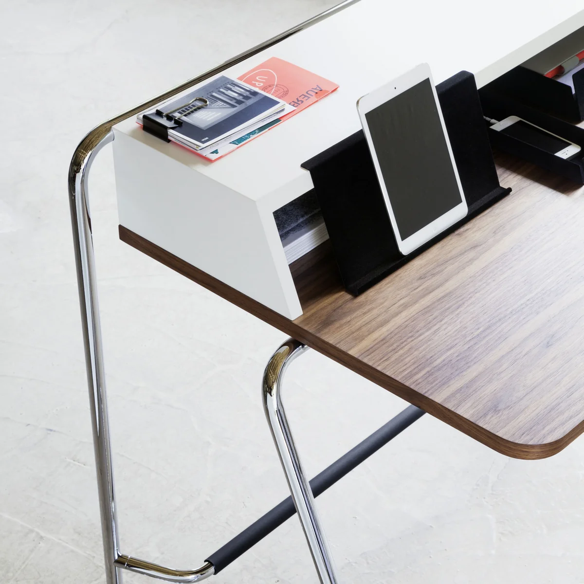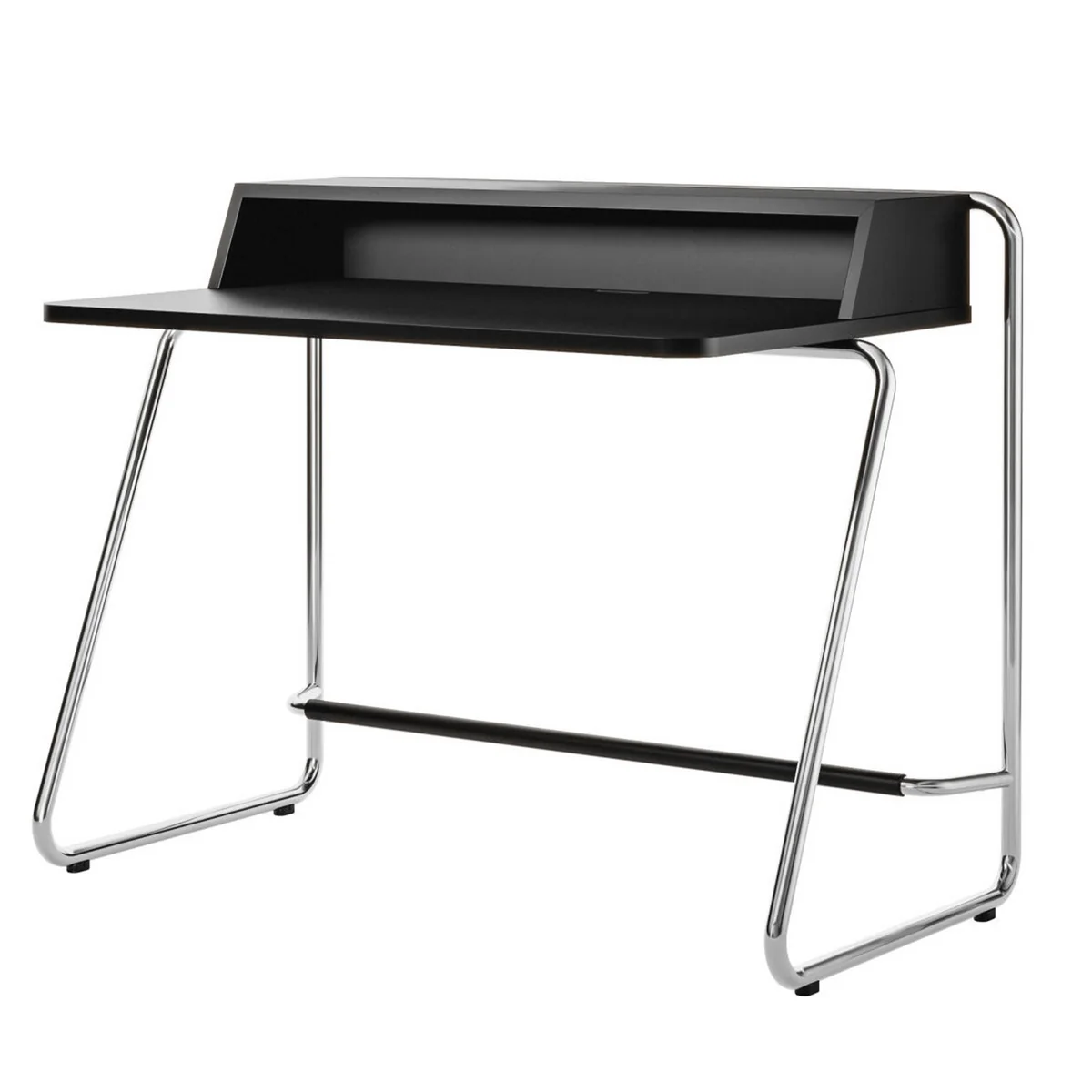 Der Sekretär ist aus einem Stahlrohrgestell verchromt oder dezenten Farben lackiert erhältlich. Für Komfort auch bei längerem Sitzen sorgt die integrierte Fussablage.