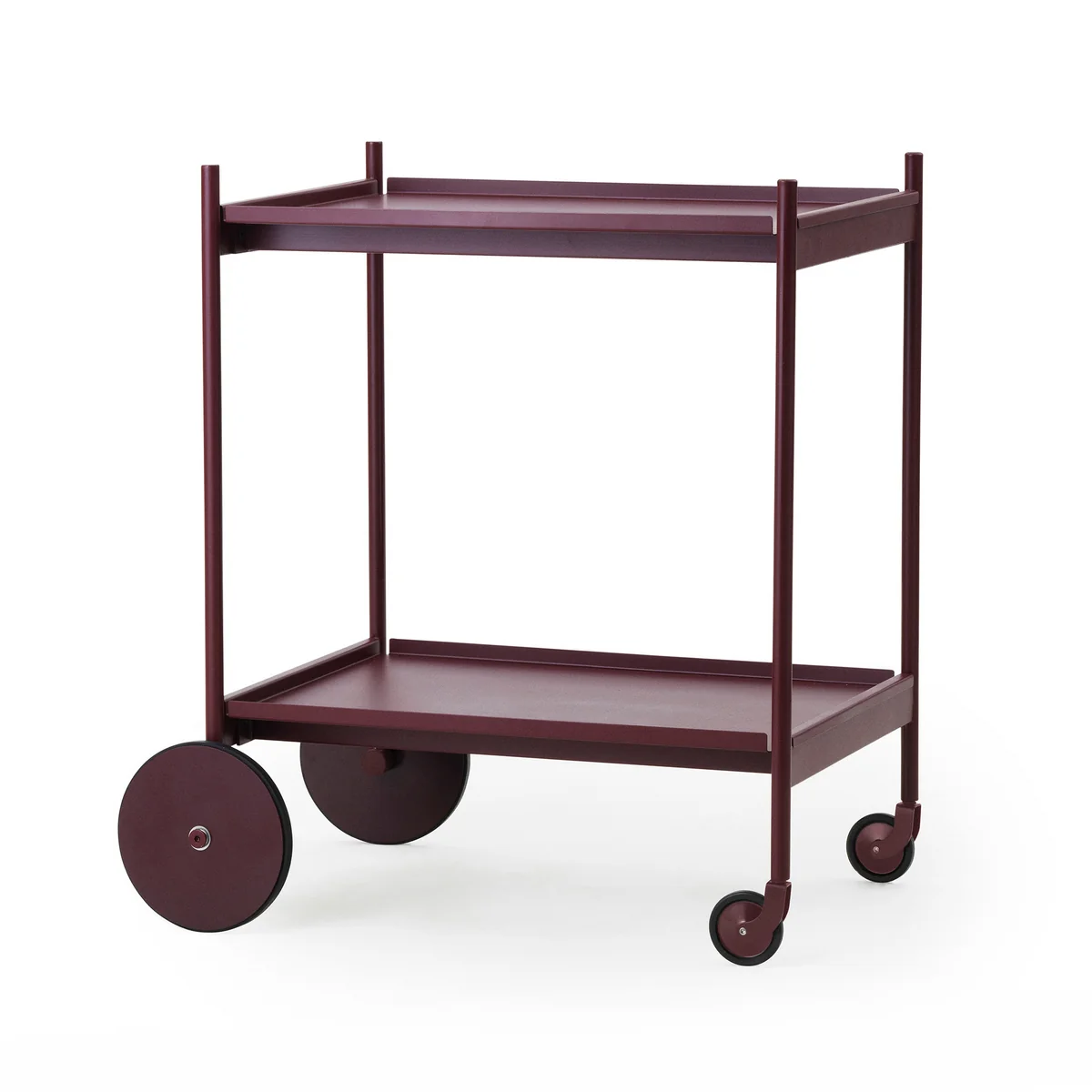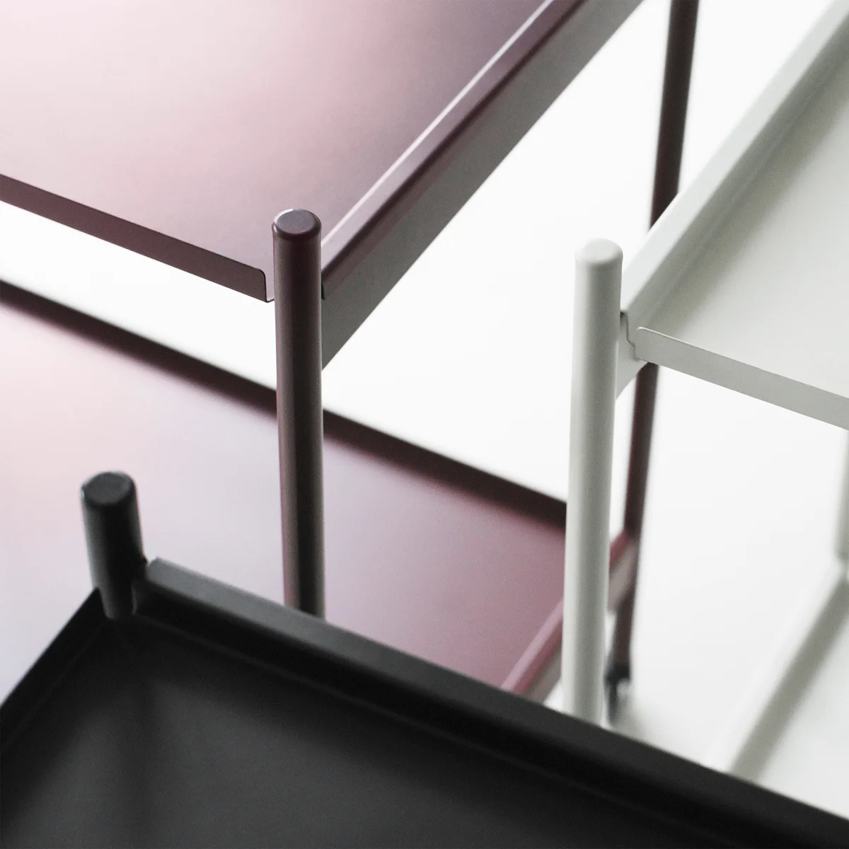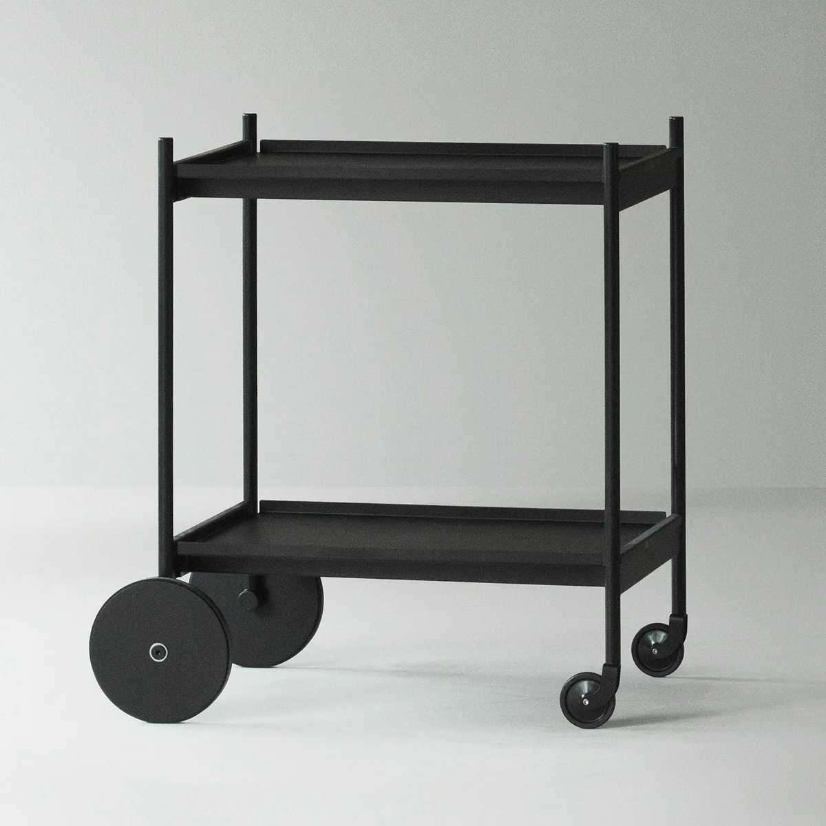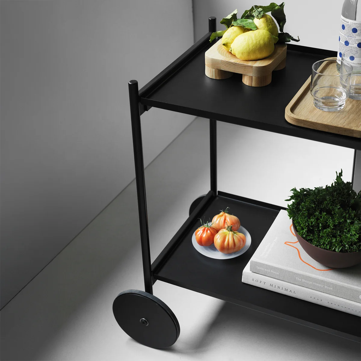 Der Rul Trolley überzeugt mit einem schlanken, minimalistischen Design und wird aus langlebigem, pulverbeschichtetem Stahl gefertigt. Seine filigrane Konstruktion verleiht ihm eine elegante Silhouette, während vier Räder für eine optimale Handhabung sorgen – zwei kleinere ermöglichen eine 360°-Beweglichkeit, während zwei grössere für zusätzliche Stabilität sorgen. Dank zwei herausnehmbarer Tabletts lässt sich der Wagen mühelos an verschiedene Alltagsbedürfnisse anpassen und bietet eine praktische Lösung für das Servieren und Aufbewahren.