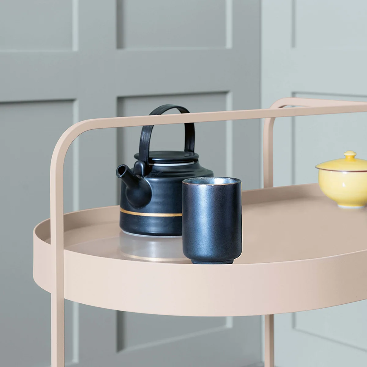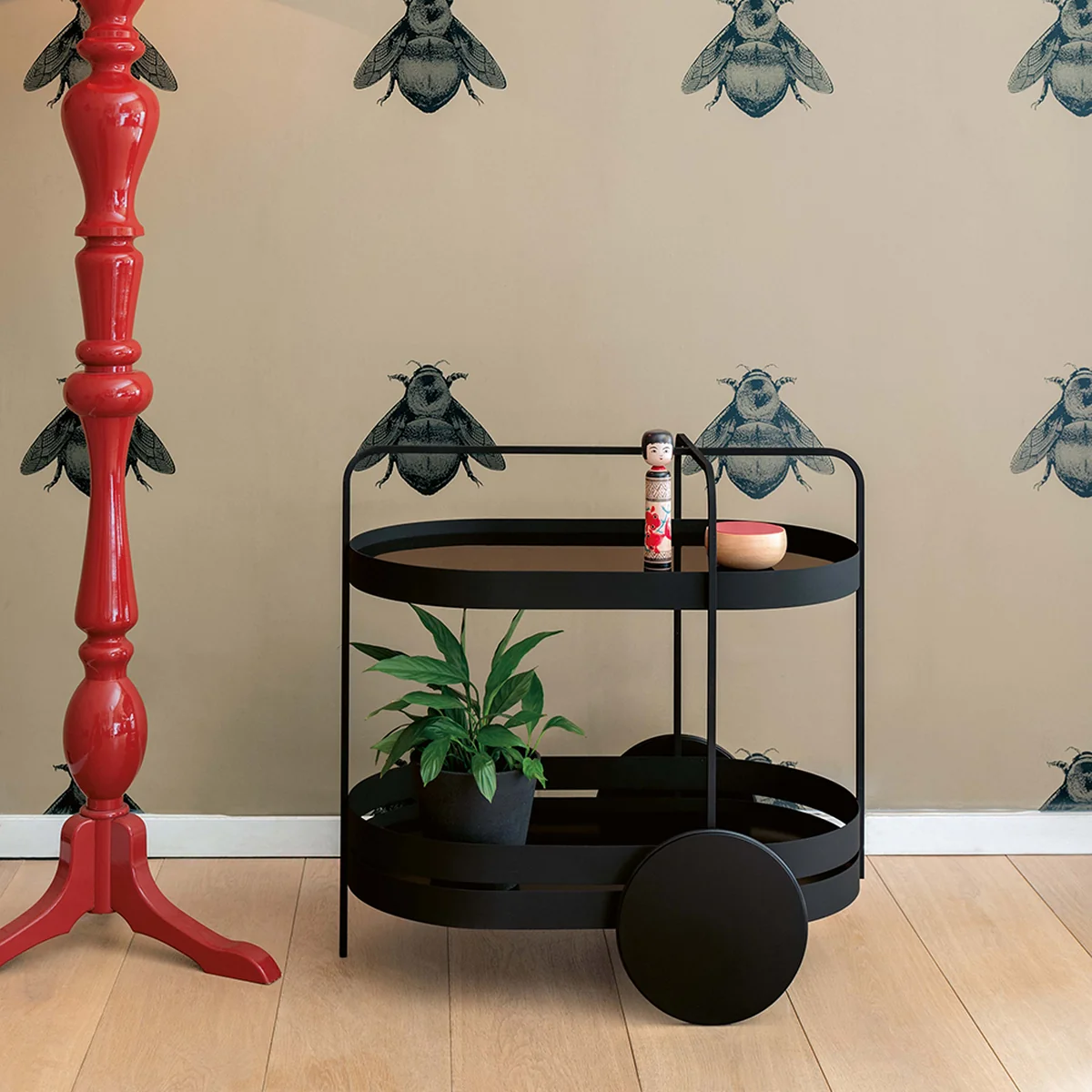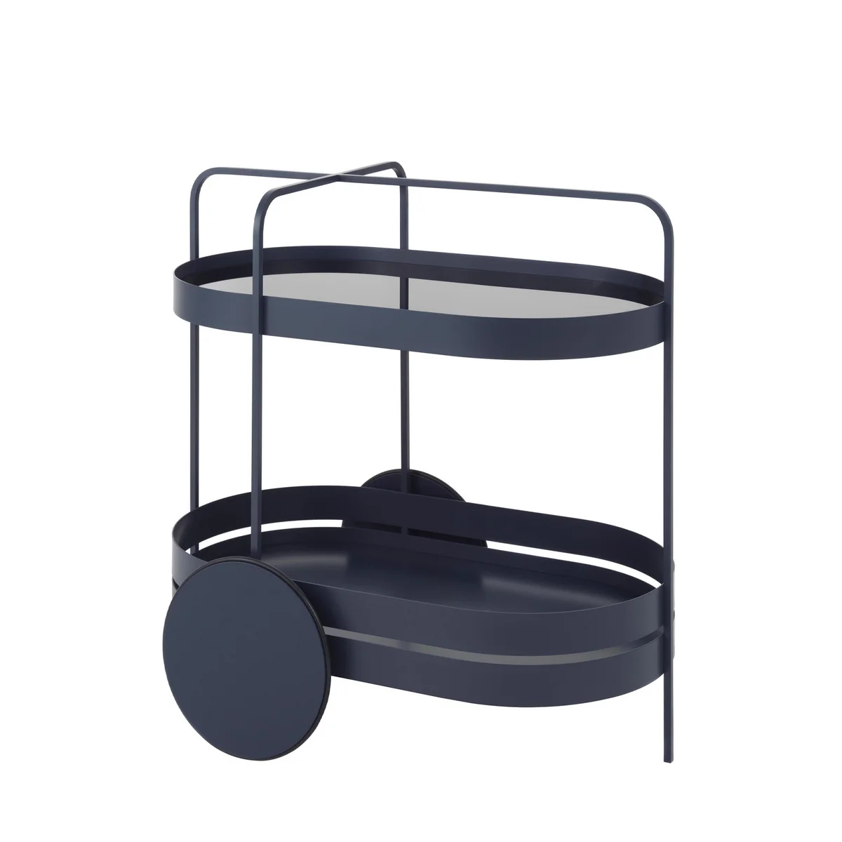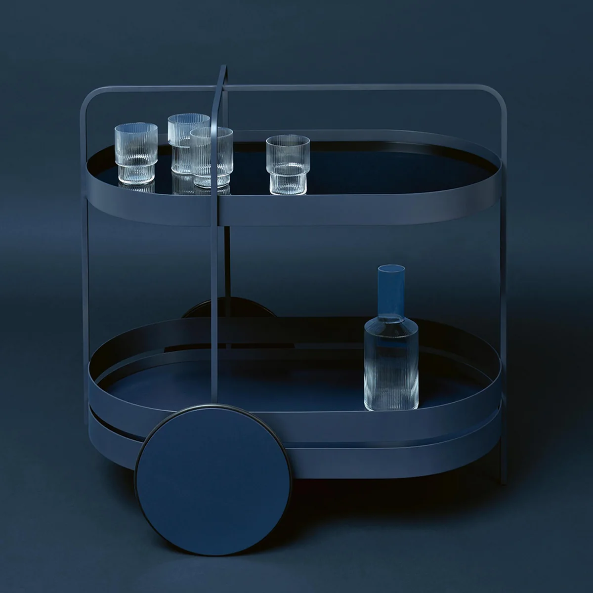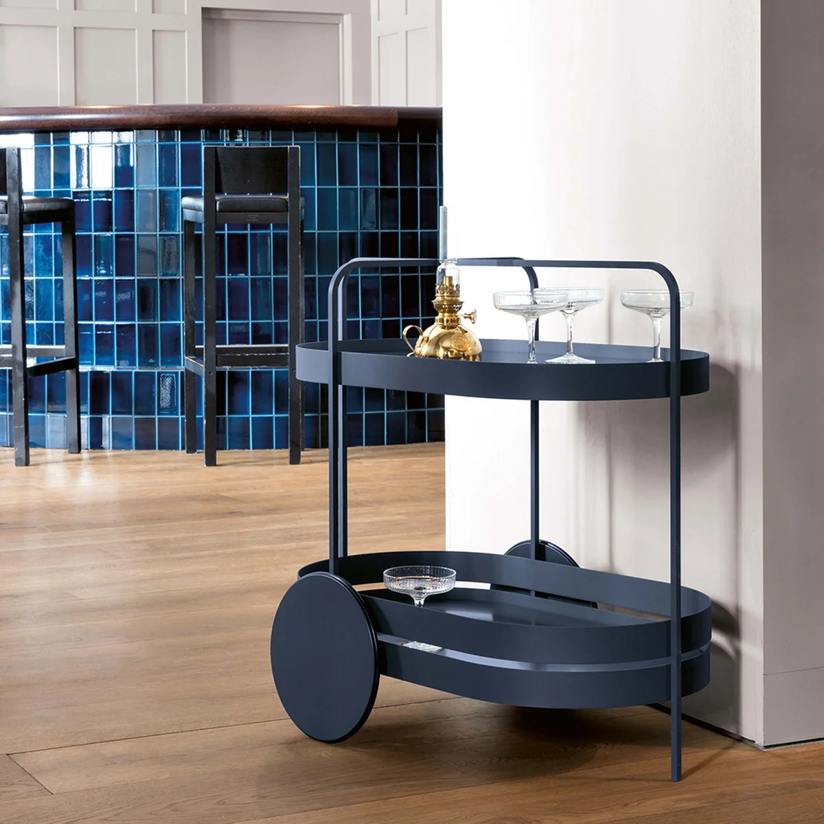 Der Servierwagen mit zwei Ebenen und Rollen wird aus pulverbeschichtetem Stahl hergestellt und ist in verschiedenen Farben erhältlich. Die obere Ablage besteht aus Glas, sie ist jeweils farblich passend rückseitig lackiert. Der Servierwagen eignet sich als mobile, hauseigene Bar, als Beistelltisch neben Sofa oder Sessel oder als Ablage neben dem Schreibtisch im Arbeitszimmer.
