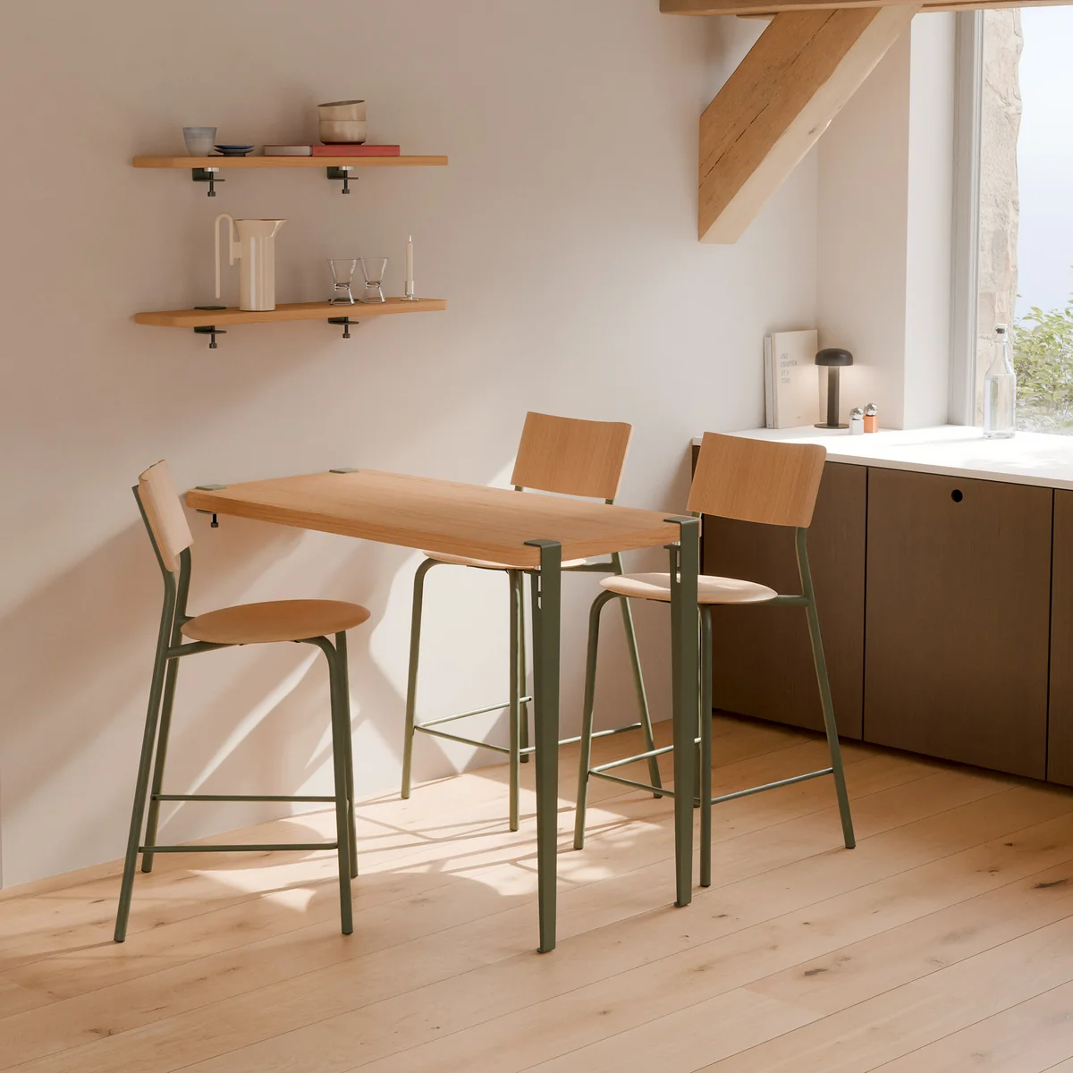 Das Bartischbein besteht je nach Wahl aus pulverbeschichtetem oder patiniertem Stahl und ist in mehreren Farben erhältlich