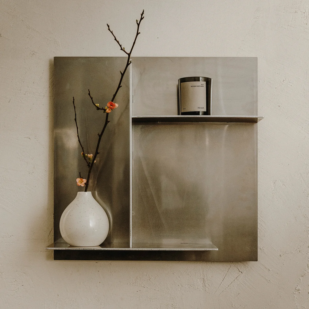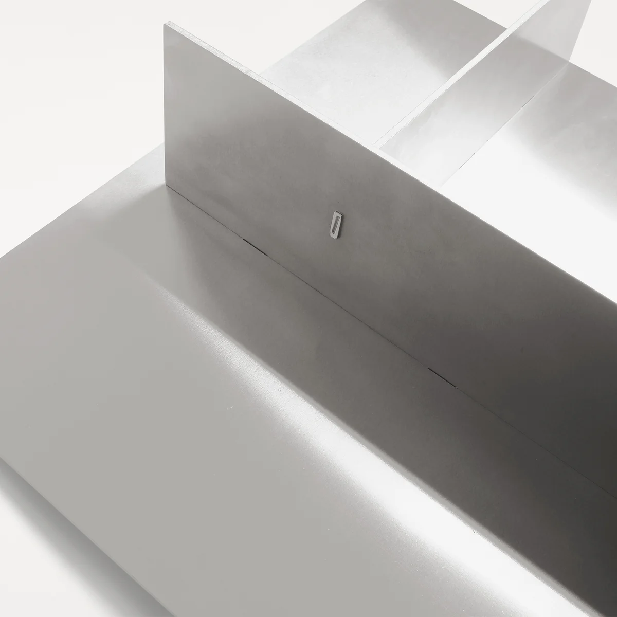 Die Rivet Typecase Wandablage von Frama wird aus Aluminium gefertigt. Das für Möbel schwierig zu bearbeitende Material mit nach traditionellem Vorbild ausgeschnitten und per Hand gehämmert. Die rohe, unbehandelte Oberfläche ist eine Hommage an den industriellen Charakter des Materials.