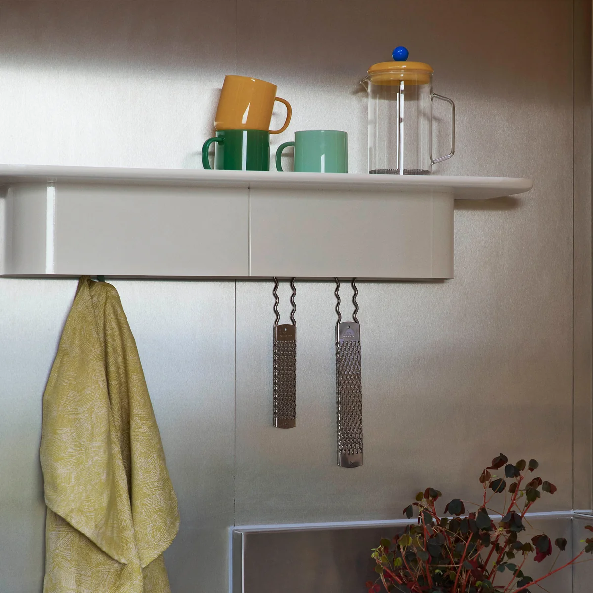Das Korpus Wandregal mit Kleiderhaken von Andreas Bergsaker für HAY begeistert mit seiner Farbfröhlichkeit. Vor dem Hintergrund ein Mehrzweckregal aus wiederverwertbaren Materialien zu entwickeln, wird das Korpus Wandregal aus Aluminiumblech hergestellt. Die Vorteile: Es ist leicht, beständig und kann unzählige Male wiederverwendet werden. Das Aluminium wird in einem industriellen Präge- und Stanzverfahren zu seinem markanten, geschwungenen Design geformt. Auf der Rückseite des Regals befinden sich Schlüssellochschlitze, wodurch die insgesamte Befestigung erleichtert wird. Die Haken sind im Inneren verdeckt, bieten jedoch zusätzliche Möglichkeiten zum Aufhängen von Jacken, Taschen und co.