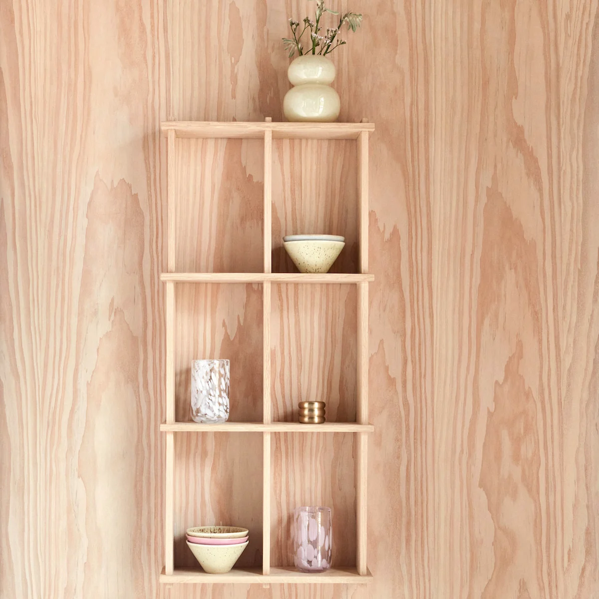 Das Grid Wandregal von OYOY wird aus hochwertiger Eiche gefertigt und verleiht der Wohneinrichtung eine Möglichkeit, die liebsten Erinnerungen, Deko Objekte oder Bücher aufzubewahren und auszustellen. Auch Gläser und Tassen oder Geschirr für besondere Anlässe können in dem stilvollen Regal ihren Platz einnehmen. Das Wandregal ist der ideale Hingucker in jedem Wohnzimmer, Schlafzimmer oder in der Küche. Vielseitig einsetzbar, kann das Regal zudem sowohl horizontal, als auch vertikal in Szene gesetzt werden.