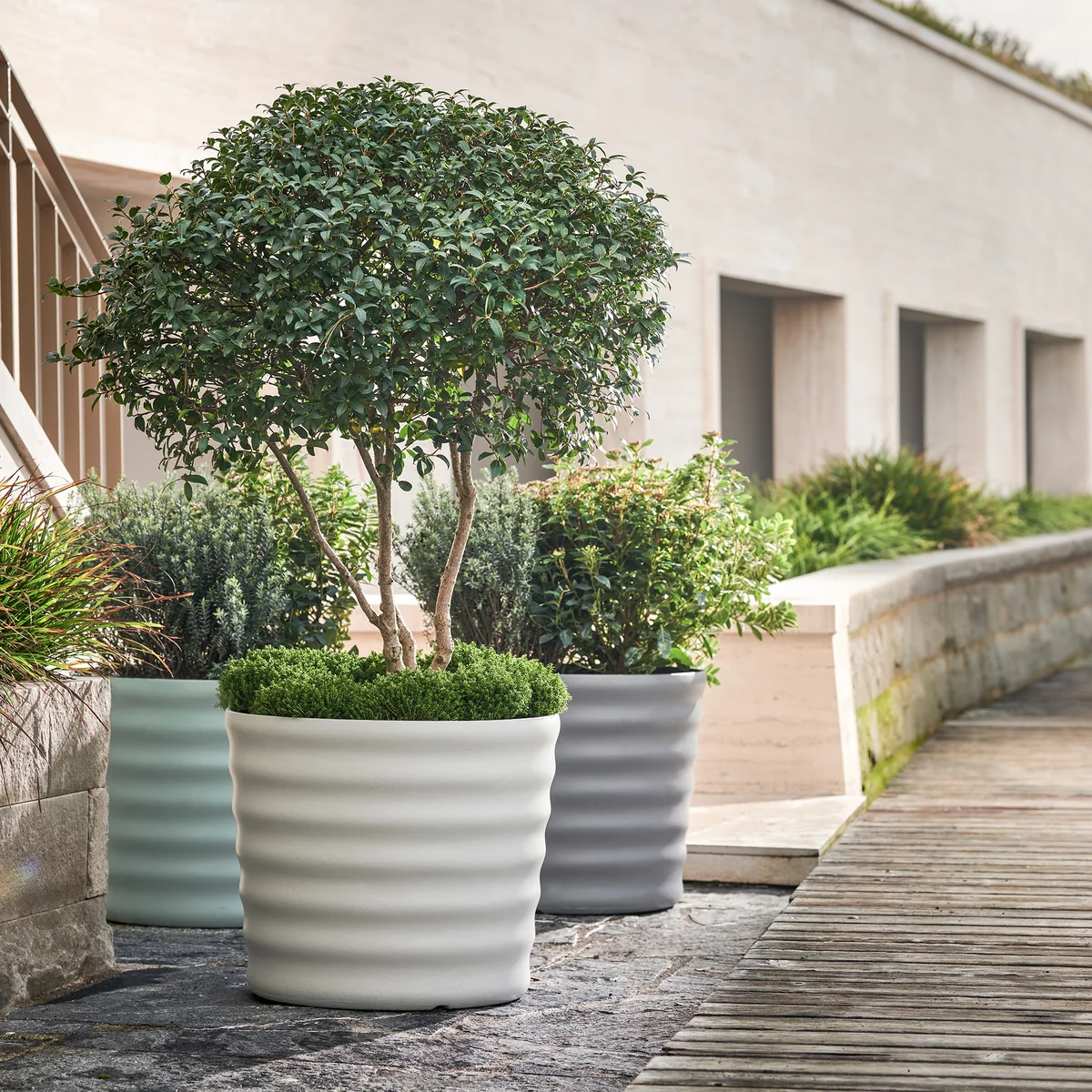 Anders als die gewöhnlichen Designs der Marke Eternit mit glatter Oberfläche, besticht das Maia Pflanzgefäss durch eine leicht gewellte und verspielte Aussenseite. Maia steht durch die dezente natürliche Färbung bewusst im Hintergrund und lenkt somit den Fokus automatisch auf die farbenfrohen Pflanzen auf dem Balkon, der Terrasse oder im Garten.