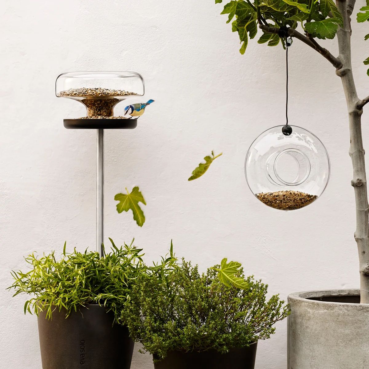 Wenn die Blätter von den Bäumen fallen und der Winter vor der Tür steht, stellen viele Menschen Futterstellen für Wildvögel auf. Eine besonders ästhetische Ausführung einer Futterstelle bietet Eva Solo mit dem mundgeblasenen Futterring aus Glas.