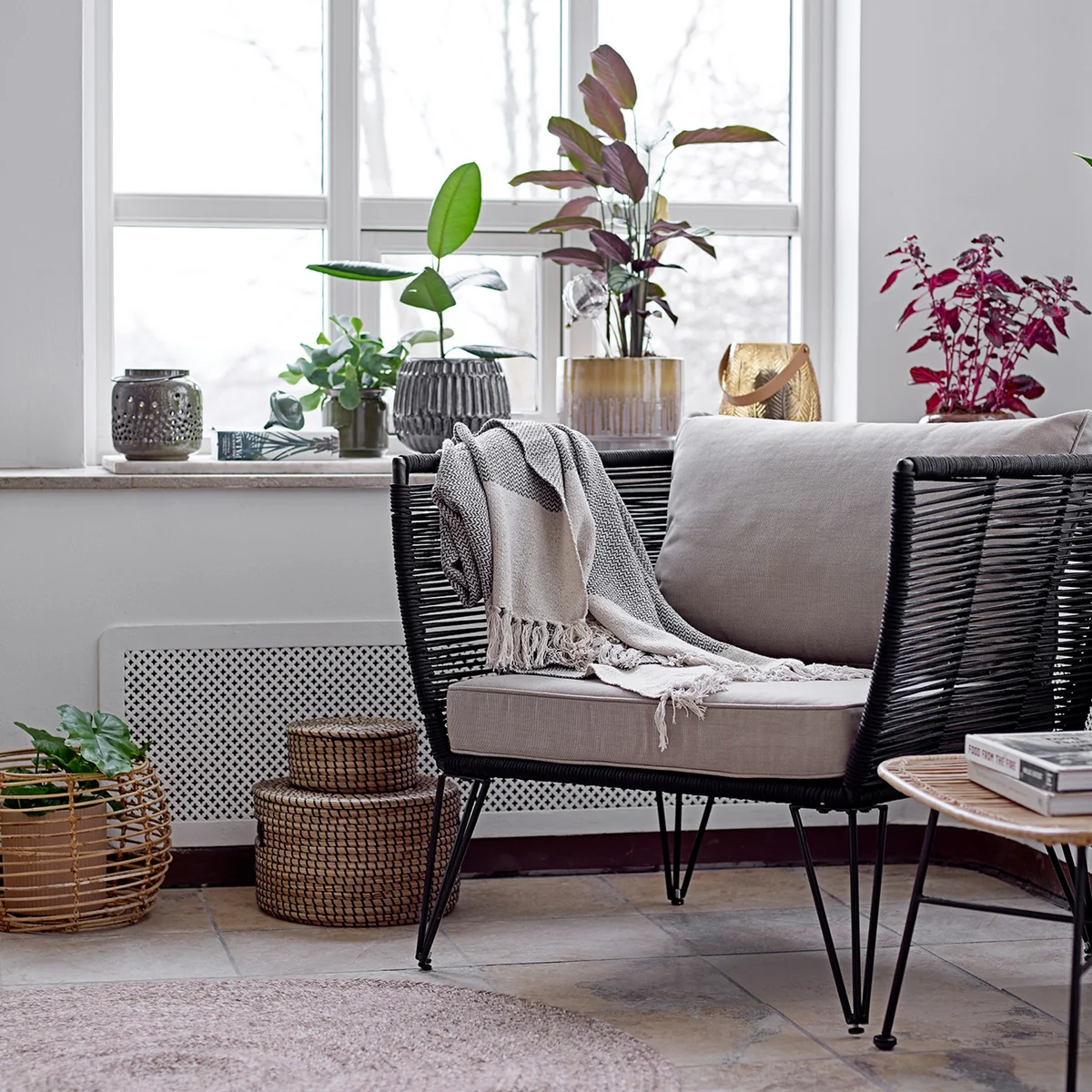Der Mundo Lounge Chair von Bloomingville ist ein bequemer Sessel mit ummantelnder Arm- und Rückenlehne und gemütlicher Polsterung für den Aussenbereich. Der Sessel besteht aus einem Gestell aus Stahl mit dekorativem Geflecht aus Polyester. Die Sitzauflage und das Kissen bestehen ebenfalls aus Polyester und sind wetterresistent.
