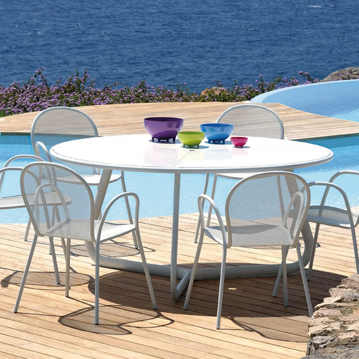 Besonders seine robuste und haltbare Ausführung macht den Emu Ronda Armlehnstuhl zum langjährigen Klassiker: Die Fertigung aus lackiertem Stahl macht den Ronda witterungsbeständig und UV-resistent. Zudem ist der von Aldo Ciabatti gestaltete Gartenstuhl mit Armlehnen stapelbar. Besonders harmonisch wirkt der Ronda in Kombination mit dem Cambi Tisch, der ebenfalls von Ciabatti im selben Stil gestaltet wurde.