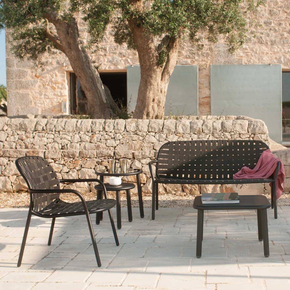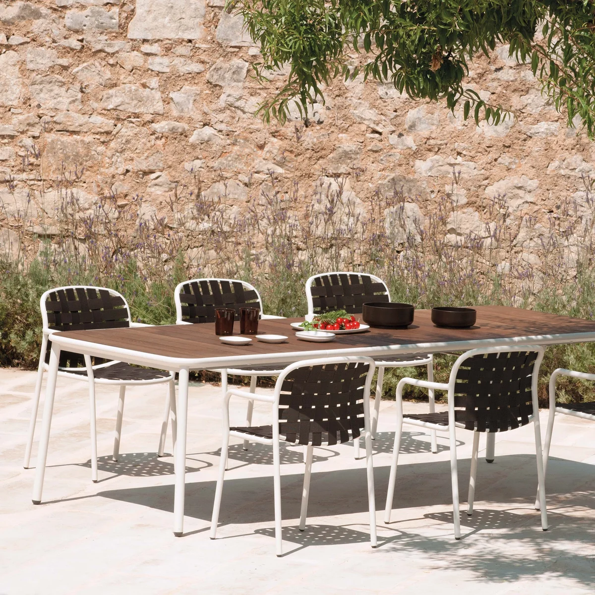 Das Gestell hingegen ist aus leichtem Aluminium gefertigt und überzeugt zum einen durch sein geringes Gewicht, wodurch sich der Stuhl einfach transportieren lässt, zum anderen besitzt es eine weiche Silhouette und abgerundete Kanten, die für ein harmonisches Gesamterscheinungsbild sorgen. Wohl geformte Armlehnen bieten zusätzlichen Komfort und garantieren entspannte Stunden in der Sonne.