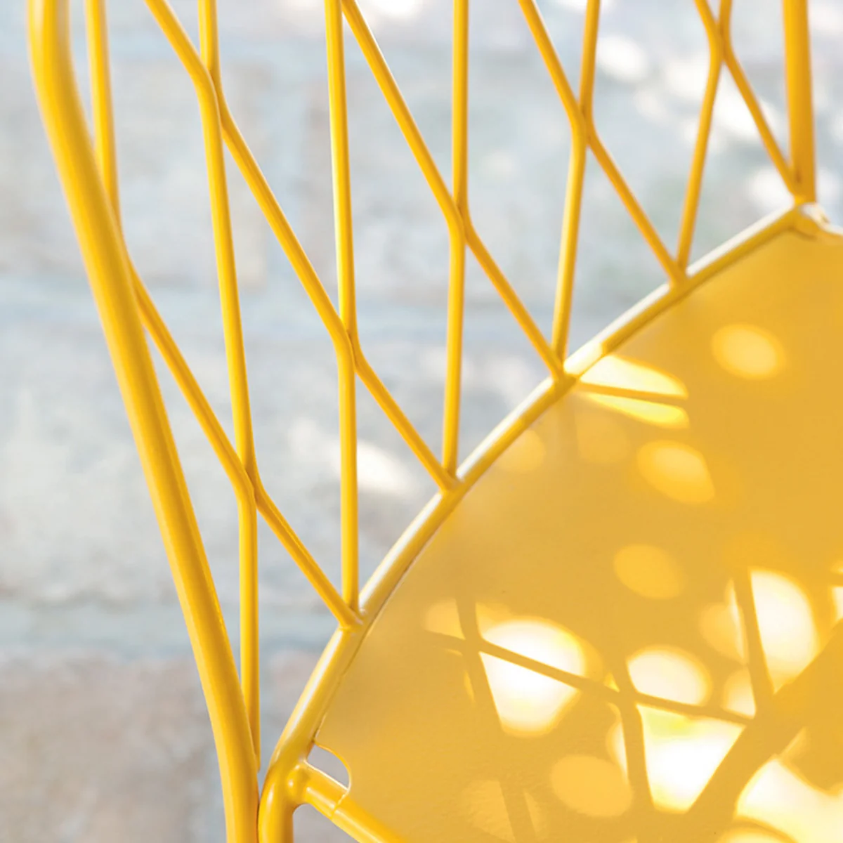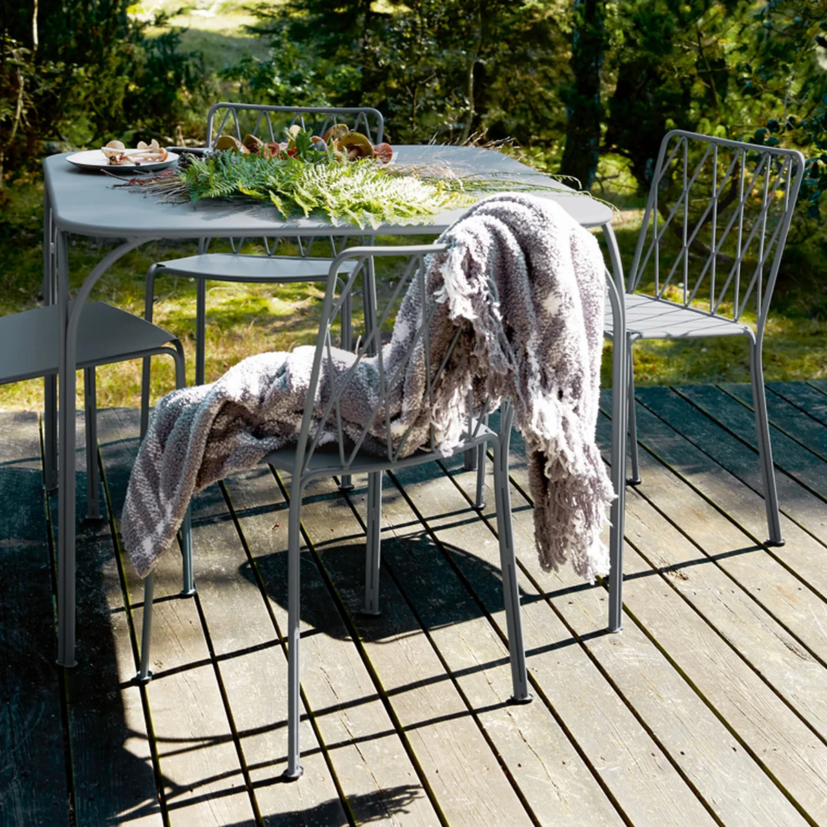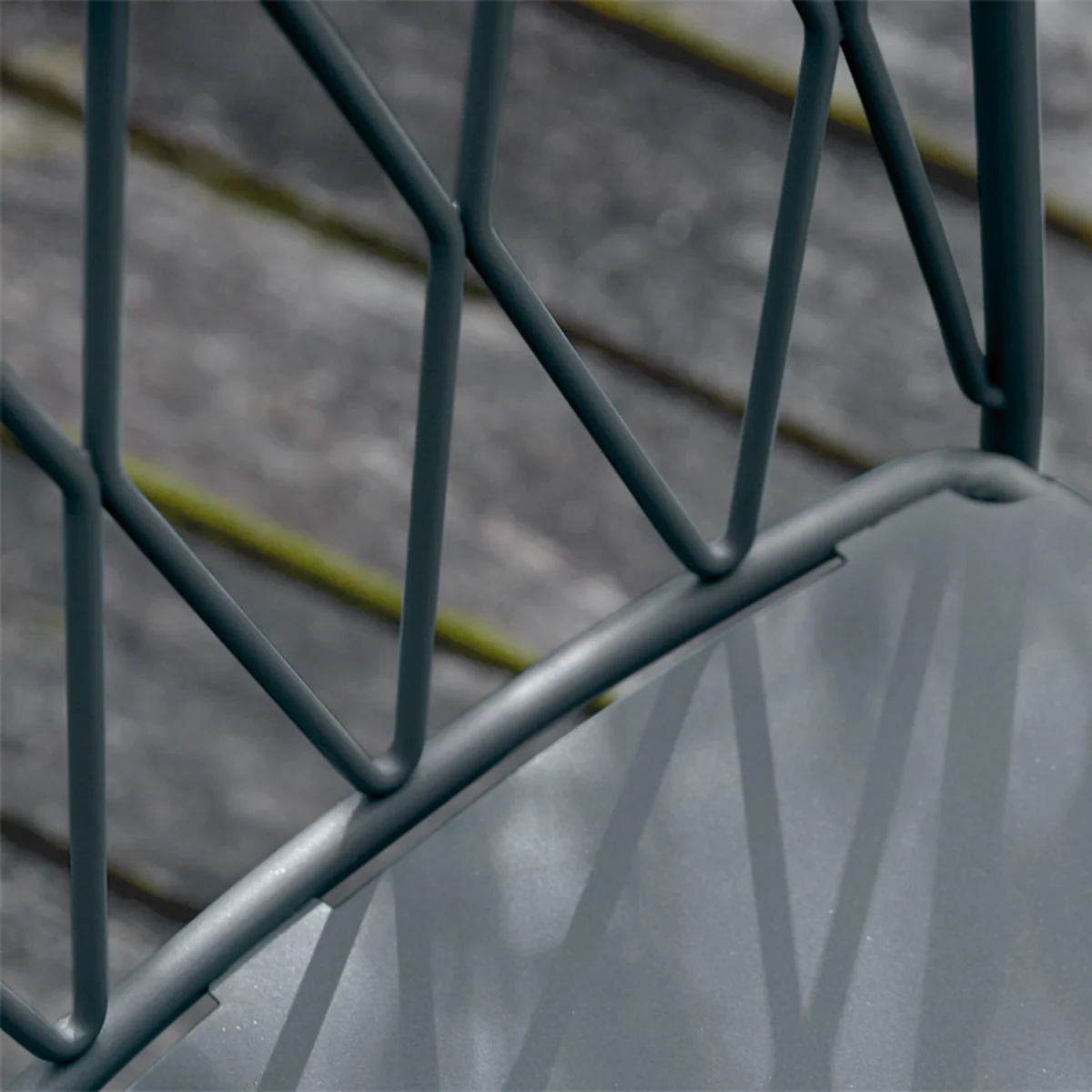 Der Outdoor-Spezialist Fermob fertigt den Kintbury Stuhl aus Stahldraht mit einer Sitzfläche aus Stahlblech, die durch eine spezielle Schutzbehandlung und Pulverlack wetterfest und UV-beständig sind. Aus Stahl gefertigt sind die Gartenmöbel sowohl äusserst robust wie auch filigran im Design.