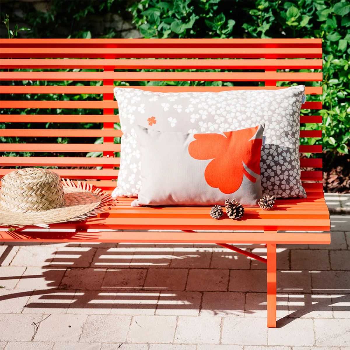 Die Rückenlehne der Bank besteht aus 20 Vierkantrohrlatten aus verzinktem Stahl. Die gesamte Louisiane Bank wurde von Fermob einer extra Hochschutzbehandlung unterzogen, sodass sie problemlos im Aussenbereich eingesetzt werden kann. Die Beschichtung des Gestells erfolgte daher auch mit einem UV-beständigen Pulverlack.
