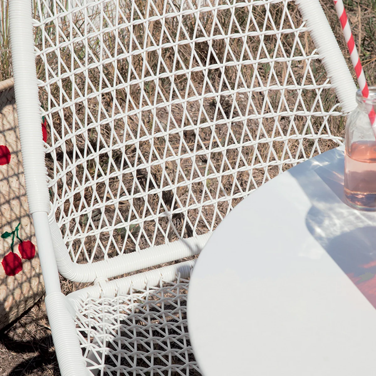 Die Sitzfläche aus geflochtenem Harz erzeugt in Kombination mit dem Aluminiumrohr des Gestells eine optische und tatsächliche Leichtigkeit. Der Sitz ist im Kriss-Kross-Muster geflochten und sehr stabil. Der gesamte Sixties Stuhl wurde von Fermob einer extra Hochschutzbehandlung unterzogen, sodass er problemlos im Aussenbereich eingesetzt werden kann. Die Beschichtung des Gestells erfolgte daher auch mit einem UV-beständigen Pulverlack.