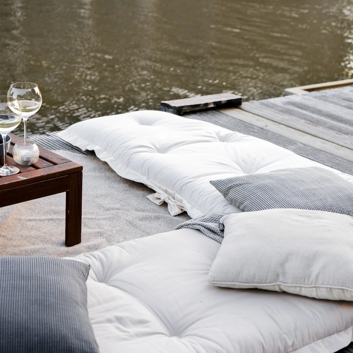 Sit and Sleep OUT von Karup Design ist ein vielseitiges Polstermöbelstück, das auf verschiedene Arten im Indoor- und Outdoor-Bereich genutzt werden kann. Die weich gepolsterte Matratze ist mit einem widerstandsfähigen Polyacryl Stoff von Dralon bezogen, der licht-, schmutz- und wasserabweisend ist. So kann sie problemlos im Garten oder auf der Terrasse genutzt werden, sollte jedoch bei Regen ins Trockene gebracht werden.