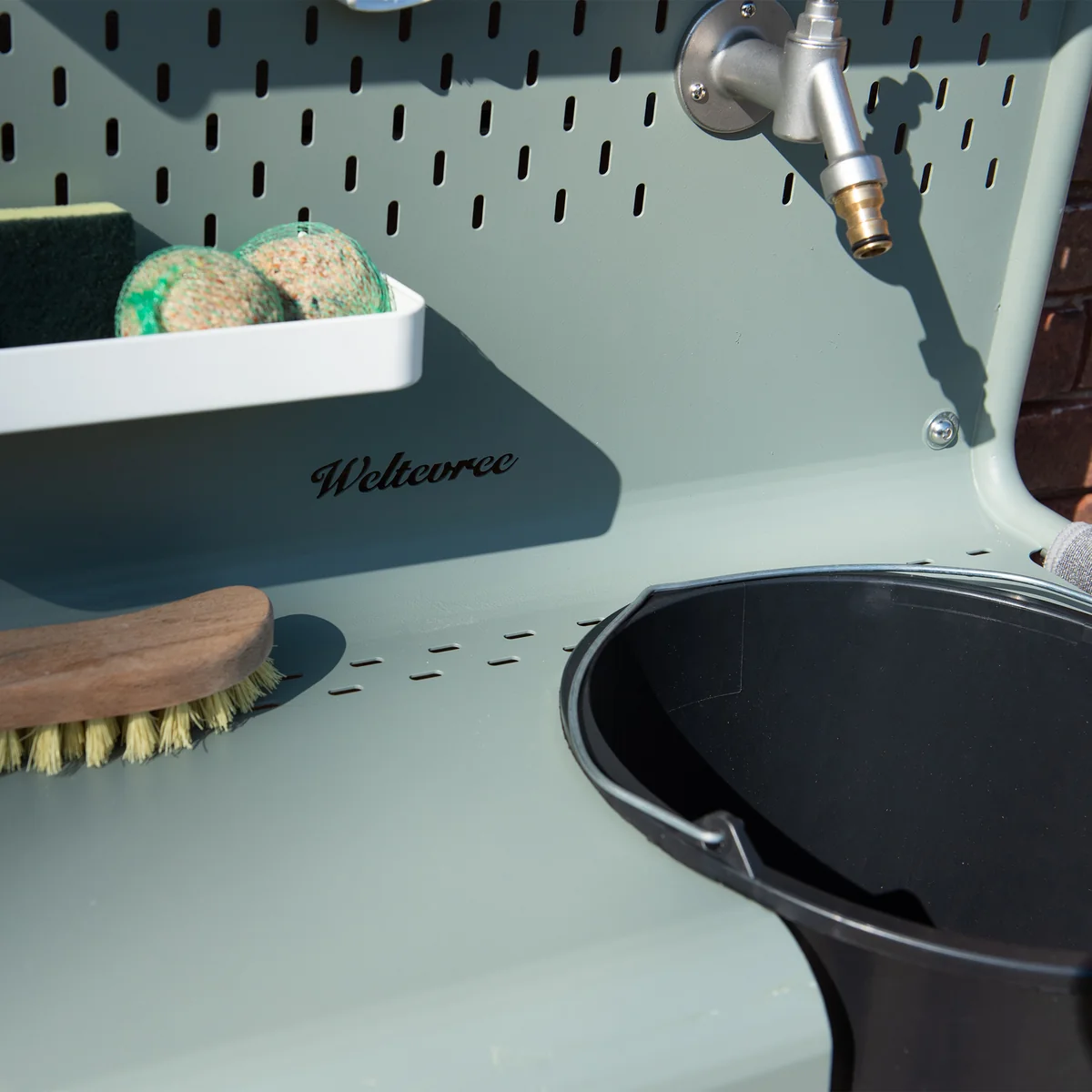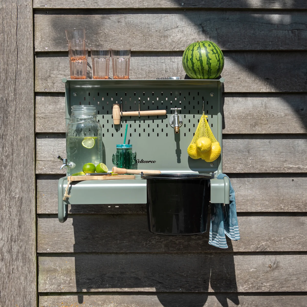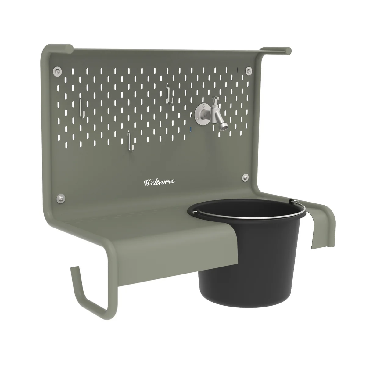 Waterworks von Weltevree schafft nützlichen Platz im Freien direkt vor dem Haus und beseitigt das Chaos rund um den Wasserhahn an der Wand. Es bietet eine Thekenfläche, einen richtigen Wasserhahn sowie weitere Ordnungshelfer, zum Beispiel einen grossen Haken für Handtücher, kleine Haken für Gartenutensilien und eine obere Ablagefläche. Auch der Eimer ist im Lieferumfang enthalten.