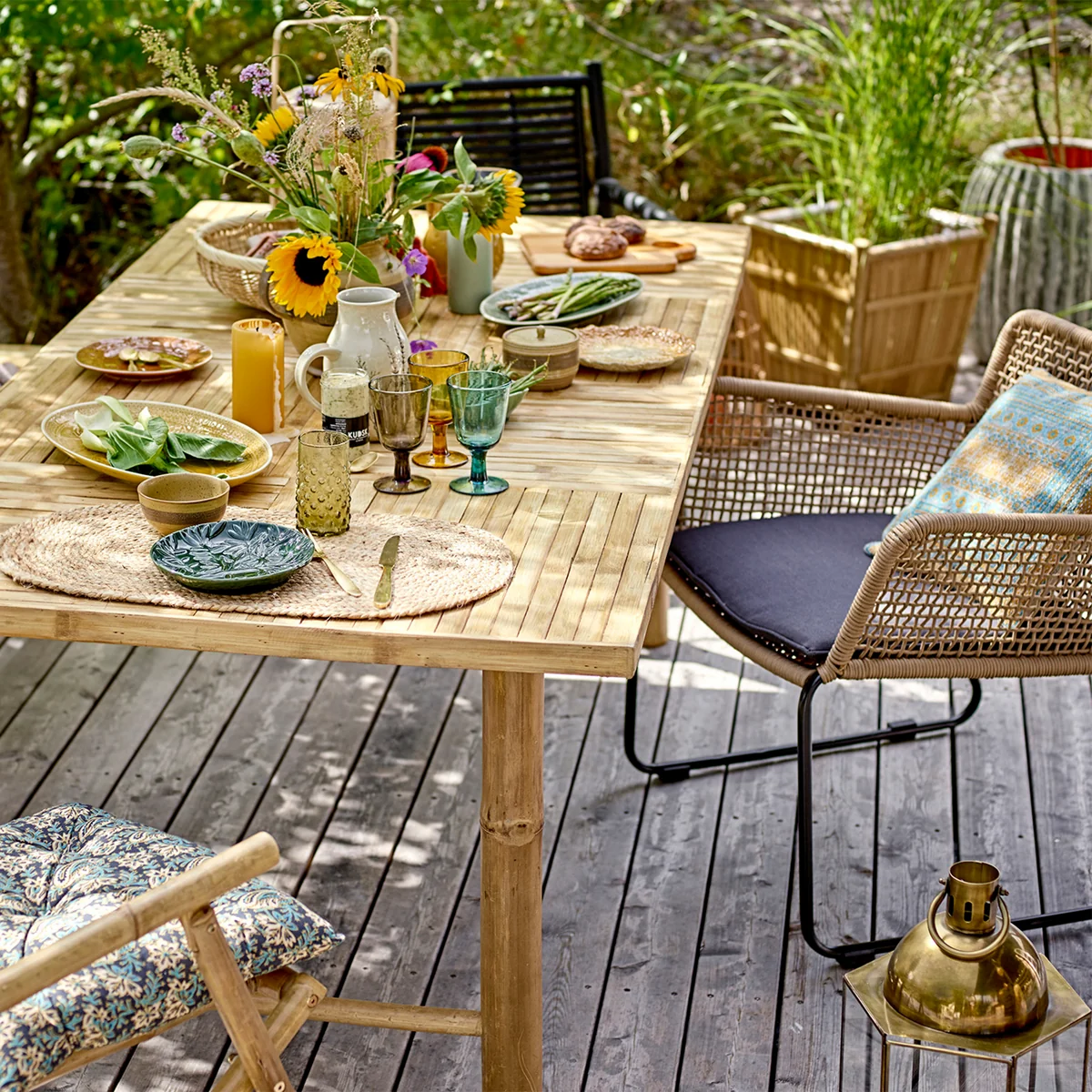 Der Mundo Outdoor Armlehnstuhl des dänischen Herstellers Bloomingville ist ein aussergewöhnlich schöner Stuhl. Die Beine werden aus pulverbeschichtetem, schwarzem Metall hergestellt. Die Sitzfläche besteht aus geflochtenem Polyesterseil. Die Kissenbezüge des Mundo Armlehnstuhls werden aus Polyester gefertigt. Um die Farbechtheit des Stoffes zu verlängern, sollte der Stuhl vor direkter Sonneneinstrahlung geschützt werden.