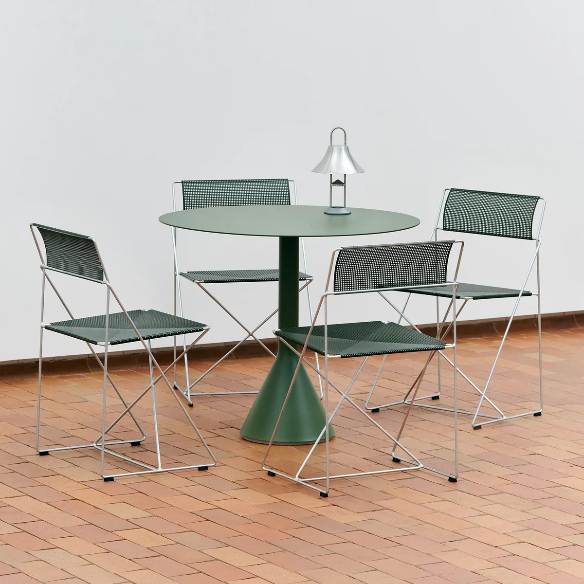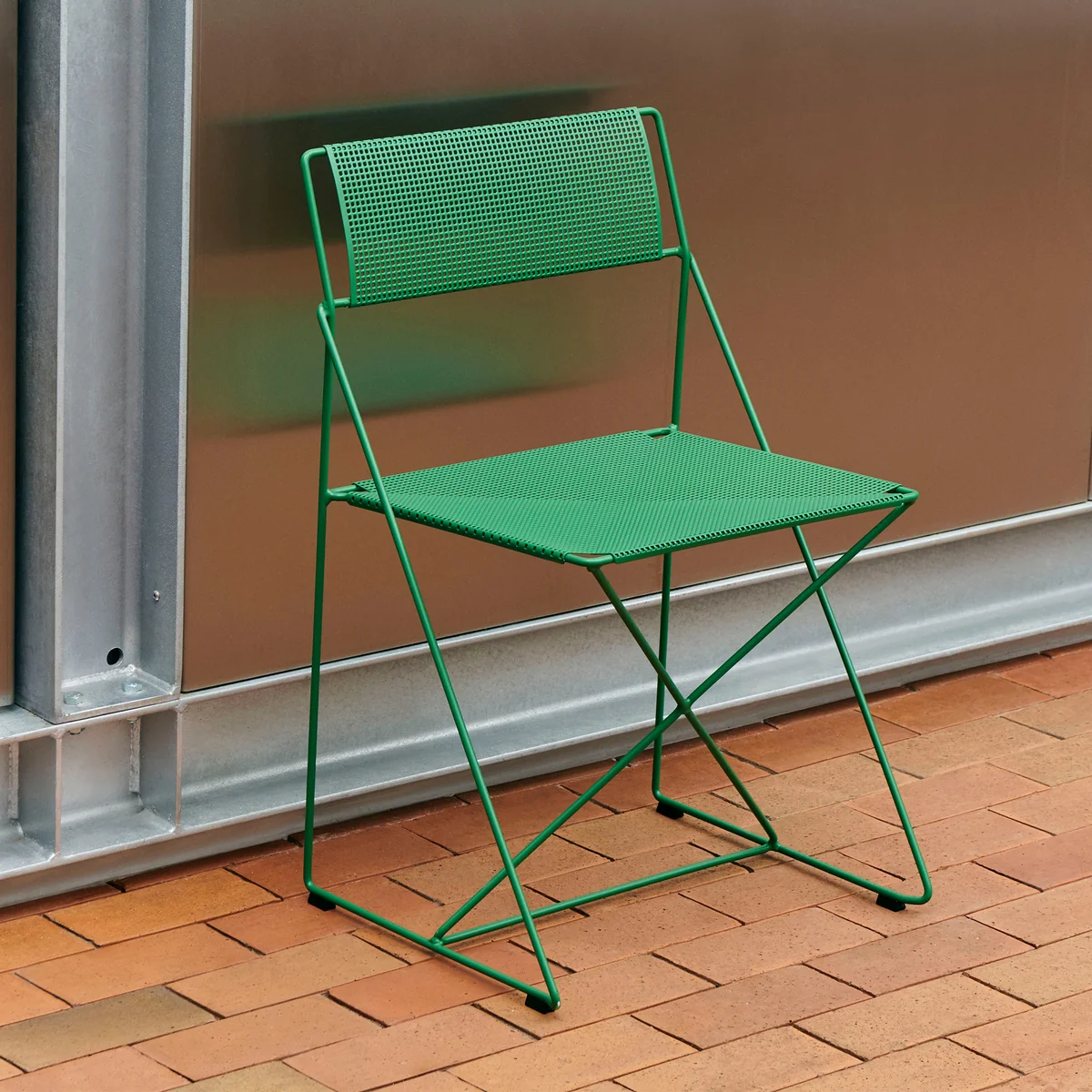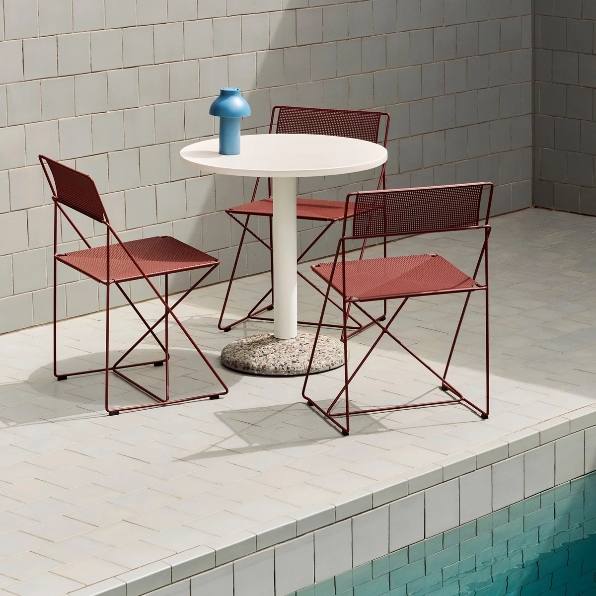 Der X-Line Outdoor Stuhl von HAY, entworfen von Niels Jørgen Haugesen in den späten 1970er-Jahren, ist ein zeitloser Klassiker mit modernem Design. Gefertigt aus dünnem Metalldraht, verbindet der Stuhl industriellen Charme mit präziser Stahlkonstruktion und ist ein herausragendes Beispiel für die High-Tech-Bewegung der 70er-Jahre.