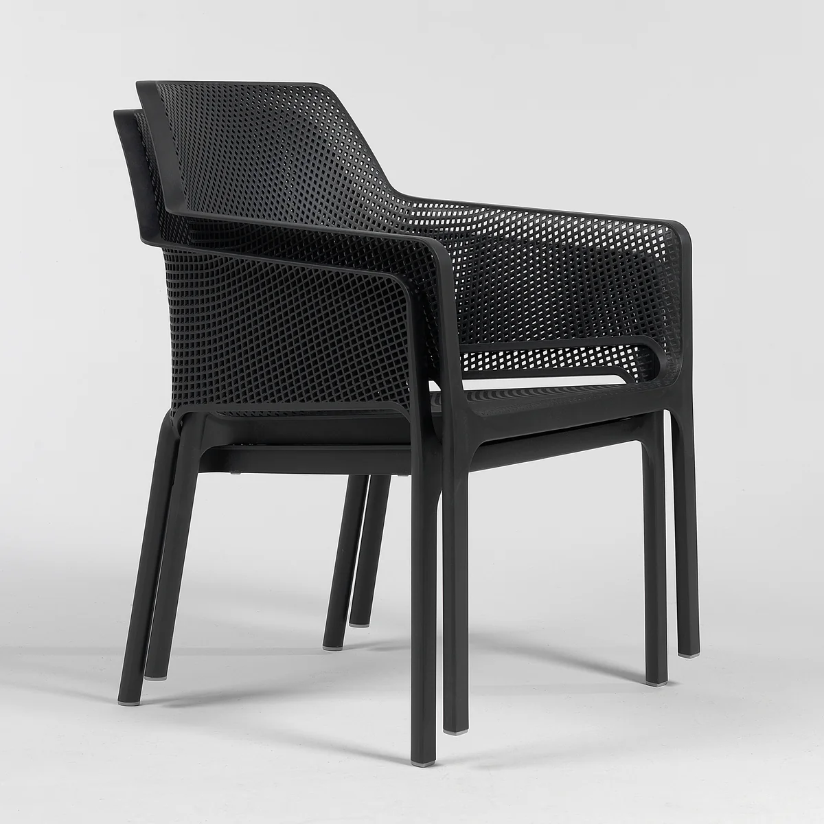 Mit seiner grosszügigen Sitzfläche, den breiten Armlehnen und dem ergonomischen Design lädt der Net Relax Stuhl zum entspannten Verweilen ein. Das filigrane Lochmuster sorgt für eine luftige Optik und macht den Stuhl leicht und angenehm. Er ist in mehreren Farben erhältlich und einfach stapelbar.