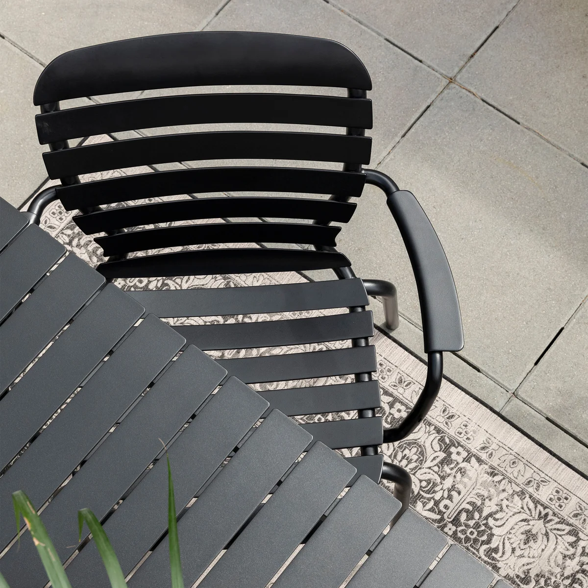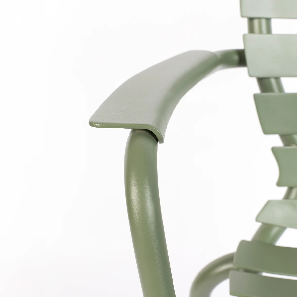 Das minimalistische Design wird durch weiche Rundungen und eine elegante Pulverbeschichtung ergänzt, die ihm eine zeitlose Modernität verleiht. Dank seiner robusten Bauweise aus Aluminium trotzt der Stuhl ganzjährig den Elementen – dabei bleibt er überraschend leicht und flexibel im Handling. Die integrierten Armlehnen sorgen für zusätzlichen Komfort, während sich das stapelbare Design als besonders praktisch bei der Lagerung erweist.