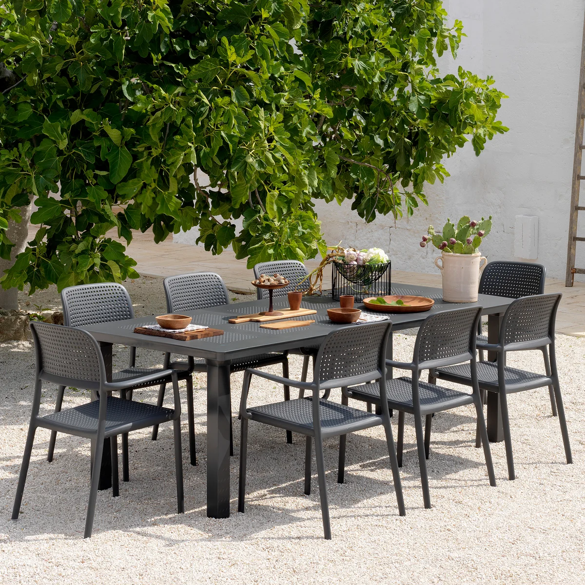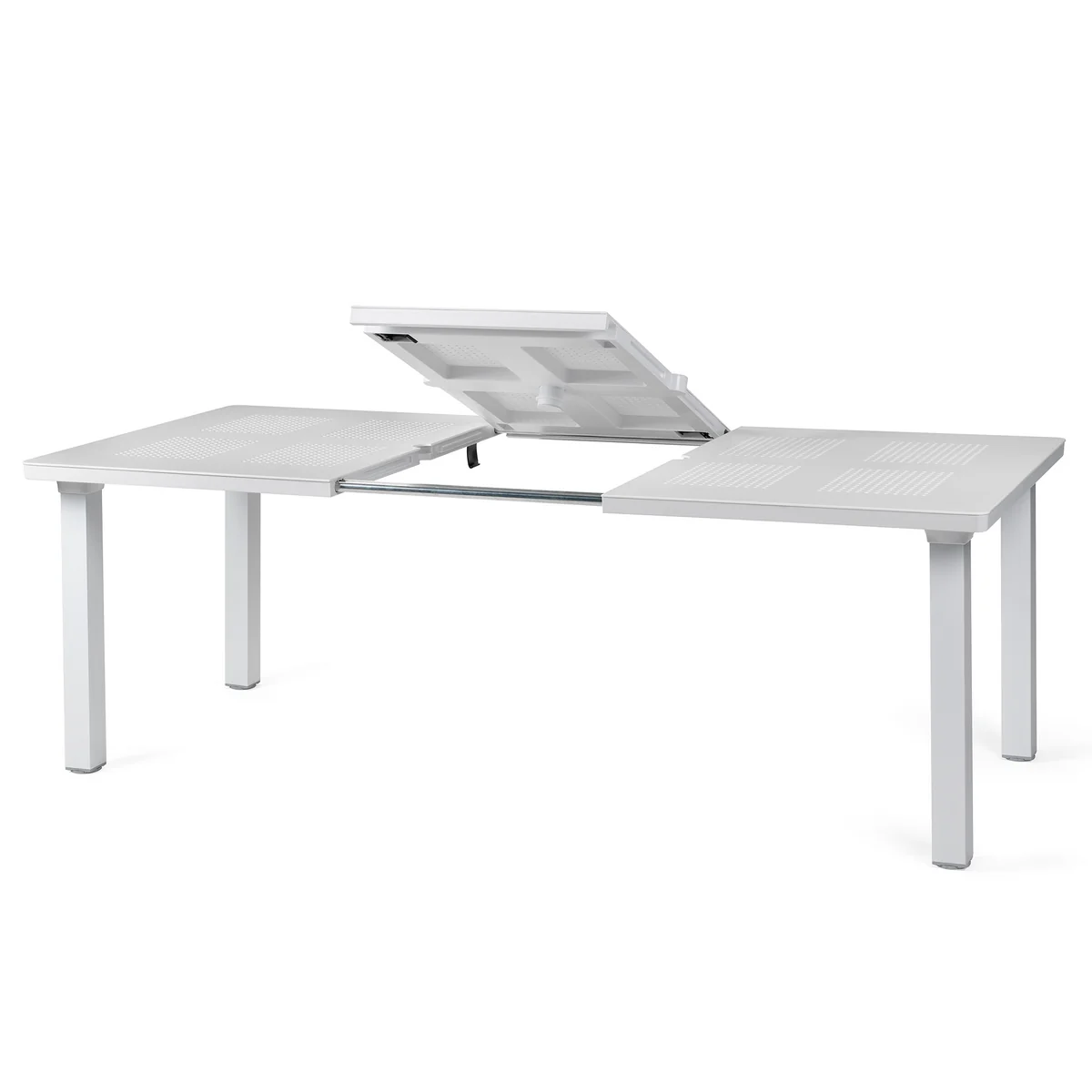 Der Levante Ausziehtisch von Nardi ist ein für den Outdoor-Bereich konzipierter Tisch aus Polypropylen, dessen Design an traditionelle Garteneinrichtungen aus Eisen erinnert. Die Tischfläche ist mit einem Muster aus kleinen Löchern dekoriert, die sich in Folge wiederholen und lässt sich von 160 cm auf 220 cm erweitern. Die Beine mit quadratischem Querschnitt sind mit einem einfachen Schraubensystem an der Fläche verankert.