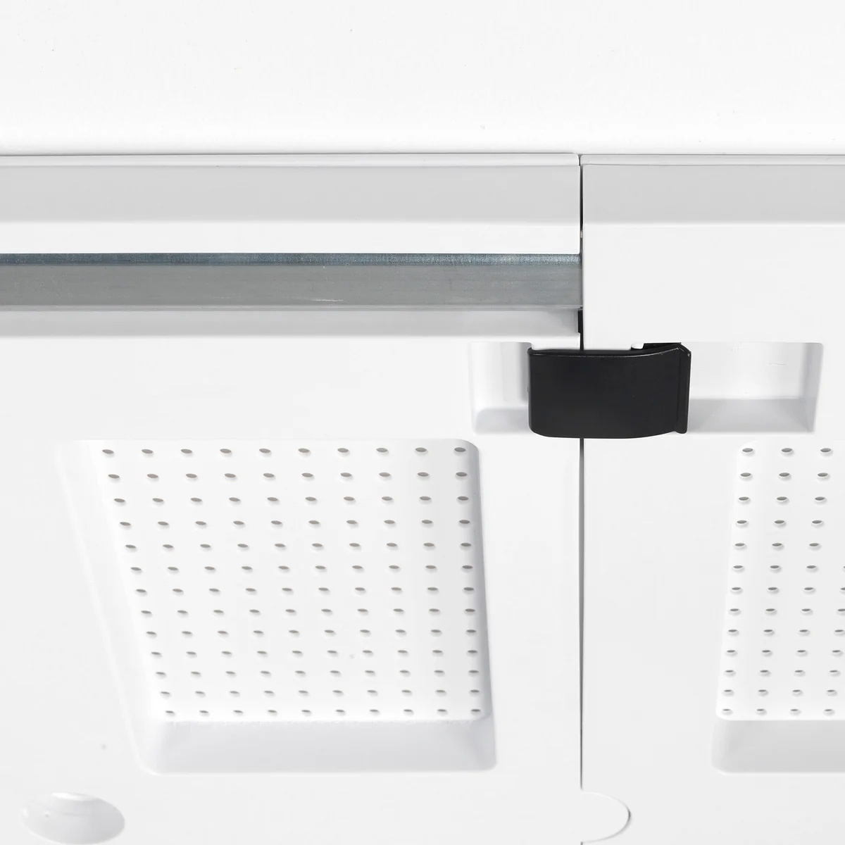 Die DurelTOP Tischplatte besteht aus recycelbarem, UV-beständigem Polypropylen, welches dank seiner vollen Durchfärbung nicht splittert. Die Füsse sind höhenverstellbar, um sich jedem Terrain anzupassen.