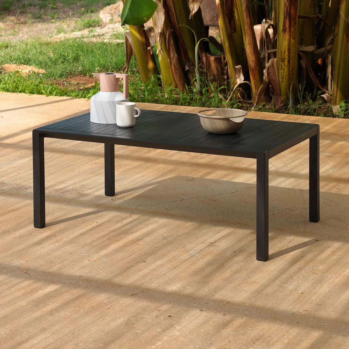 Tischplatte sowie Beine sind aus epoxiertem Aluminium gefertigt sind damit hervorragend für die Nutzung im Aussenbereich geeignet. Das Material ist resistent gegenüber jeglicher Witterung. Die Tischplatte ist lattenförmig angeordnet, sodass anfallendes Regenwasser einfach abfliessen kann und sich keine lästigen Pfützen bilden. Praktisch ist zudem, dass sich die Höhe der Füsse angleichen lässt. So findet der Tisch auch auf unebenen Terrassen einen festen, gleichmässigen Stand.
