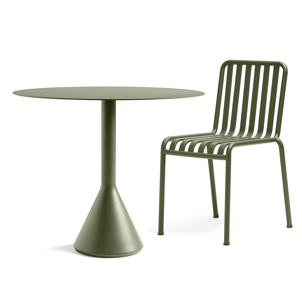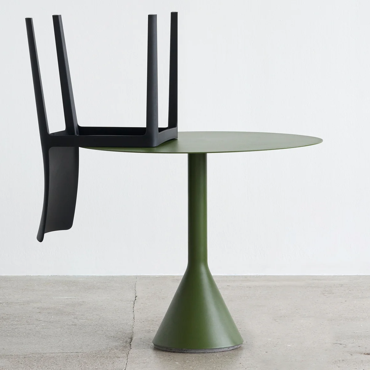 Ergänzend zur beliebten Palissade Serie von HAY findet nun auch ein runder Gartentisch namens Cone seinen Weg in die Kollektion. Der Tisch zeichnet sich durch seine mit Beton stabilisierte Basis in Kegelform (eng. Cone) aus. Dennoch wirkt der Tisch keinesfalls klobig. Zusammen mit der ultradünnen Tischplatte aus Stahl entsteht eine eher grafische Designsprache, die sich auch beim Rest der von Ronan & Erwan Bouroullec entworfenen Serie wiederfindet.