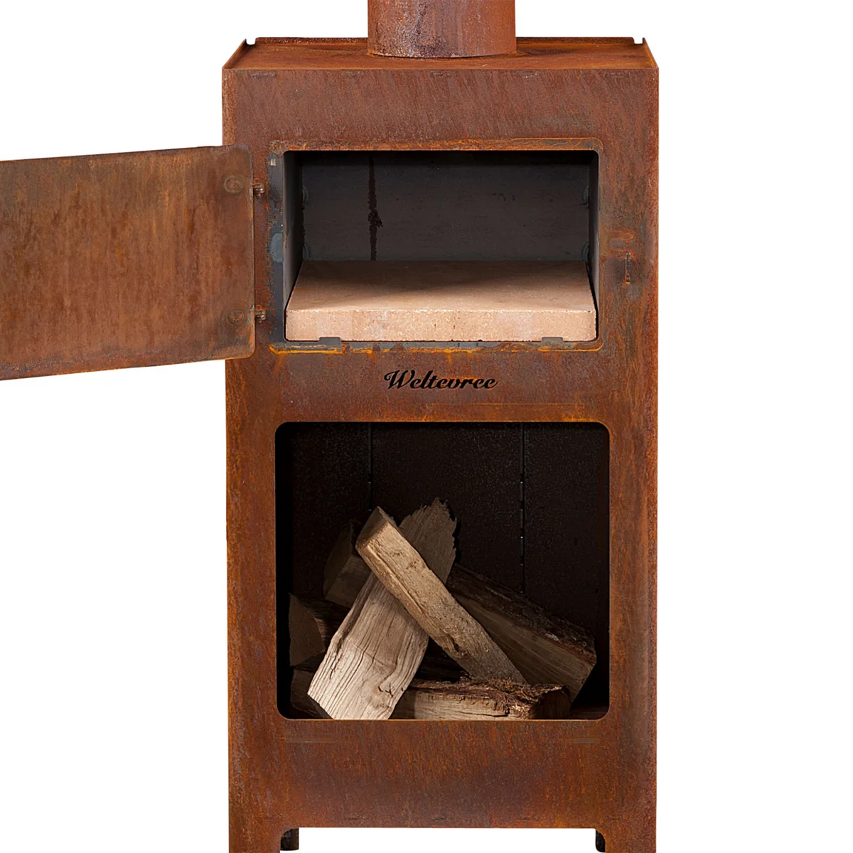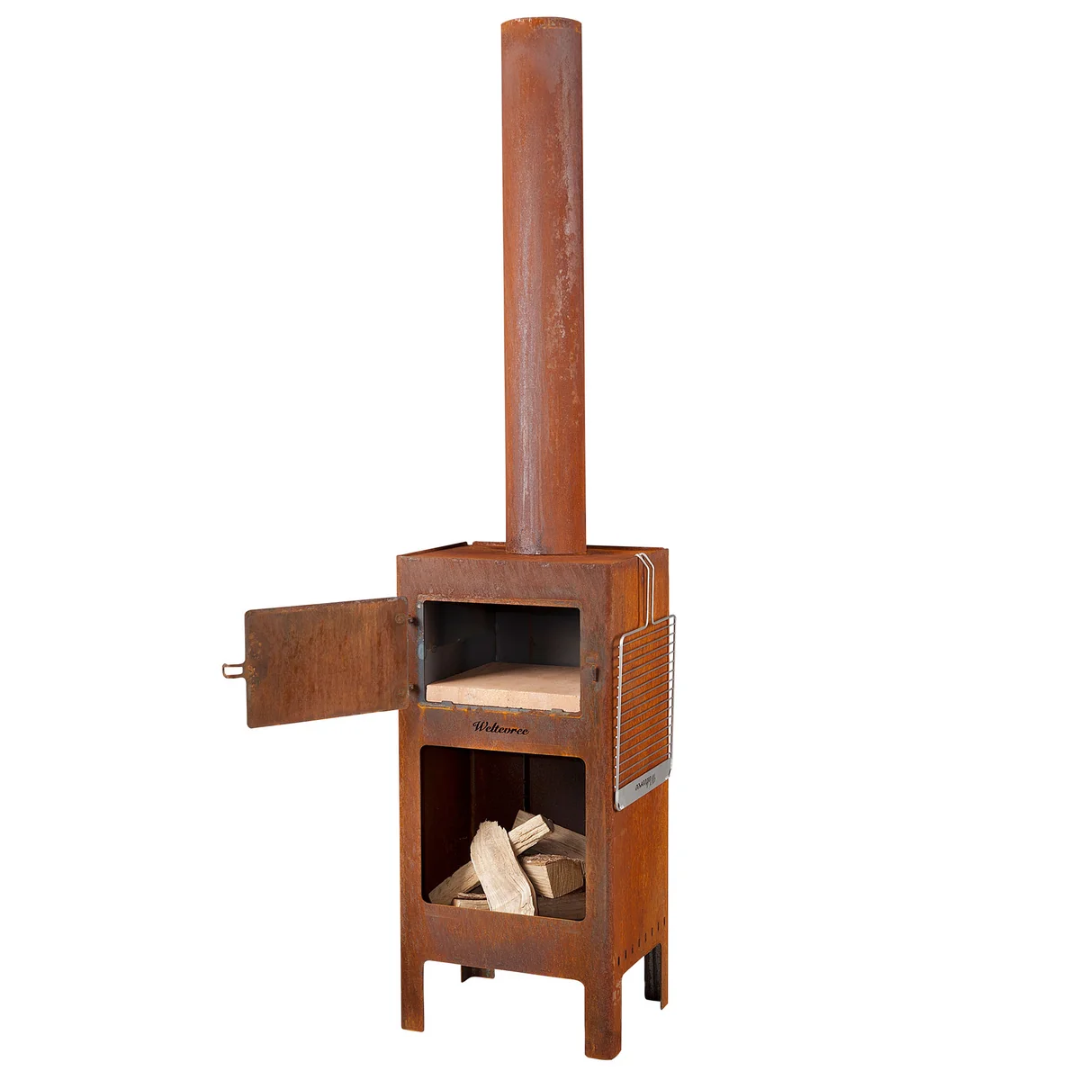 Geheizt wird der Ofen mit Hilfe von Holz, das offen lodert und als gemütliche Feuerquelle an lauen Sommerabenden oder kalten Wintertagen dient. Ein perforiertes Panel sorgt für eine ausreichende Sauerstoffzufuhr für das Feuer.