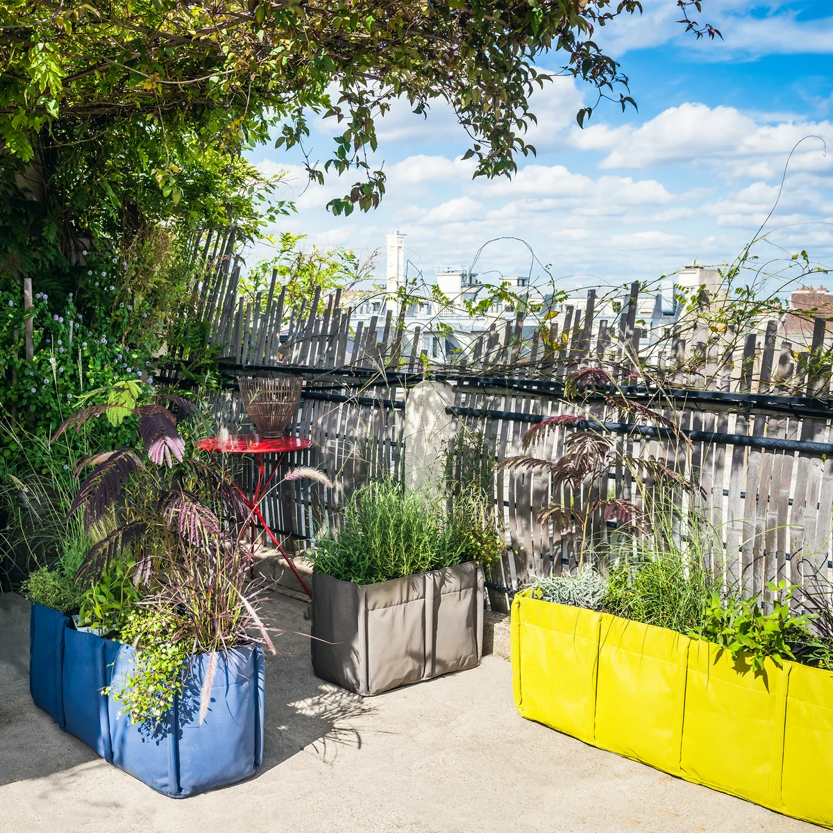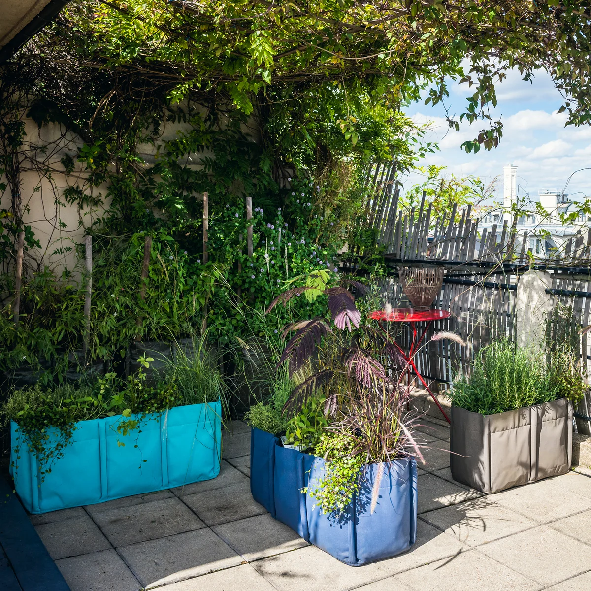 Designer Godefroy de Virieu und die Landschaftsgärtner Louis de Fleurieu und Virgile Desurmont schufen hierfür eine Kollektion von Pflanzsäcken, die aus 100% recyclebarem Geotextil oder Batyline bestehen, atmungsaktiv und wasserdicht, sowie UV-beständig und frostresistent sind. Die Bacsac Pflanztaschen sind ausserdem enorm leicht und lassen sich im Gegensatz zu schweren Pflanzkübeln bequem und einfach auf jede Dachterrasse transportieren.