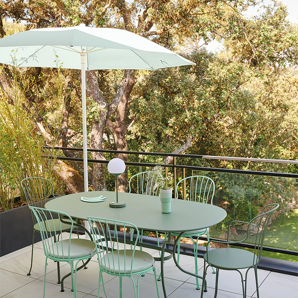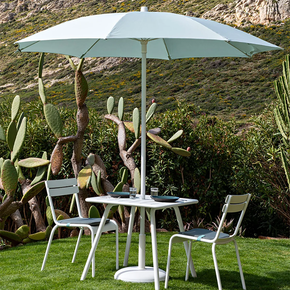 Der Shadoo Sonnenschirm von Fermob bietet Ihnen optimalen Schutz vor der Sonne. Der 2,5 Meter breite Schirm wird aus starkem, reissfestem Sunbrella-Gewebe gefertigt. Sunbrella-Gewebe hat den Vorteil, dass es wasserabweisend und resistent gegen UV-Strahlen, Flecken und Schimmel ist. Durch den Aluminiumstiel und die Fiberglasrippen ist das gesamte Konstrukt robust, lässt sich jedoch gleichzeitig problemlos nach Belieben bewegen. Der Stiel kann in Zwei geteilt werden, sodass er wenig Platz einnimmt und somit simpel verstaut werden kann.