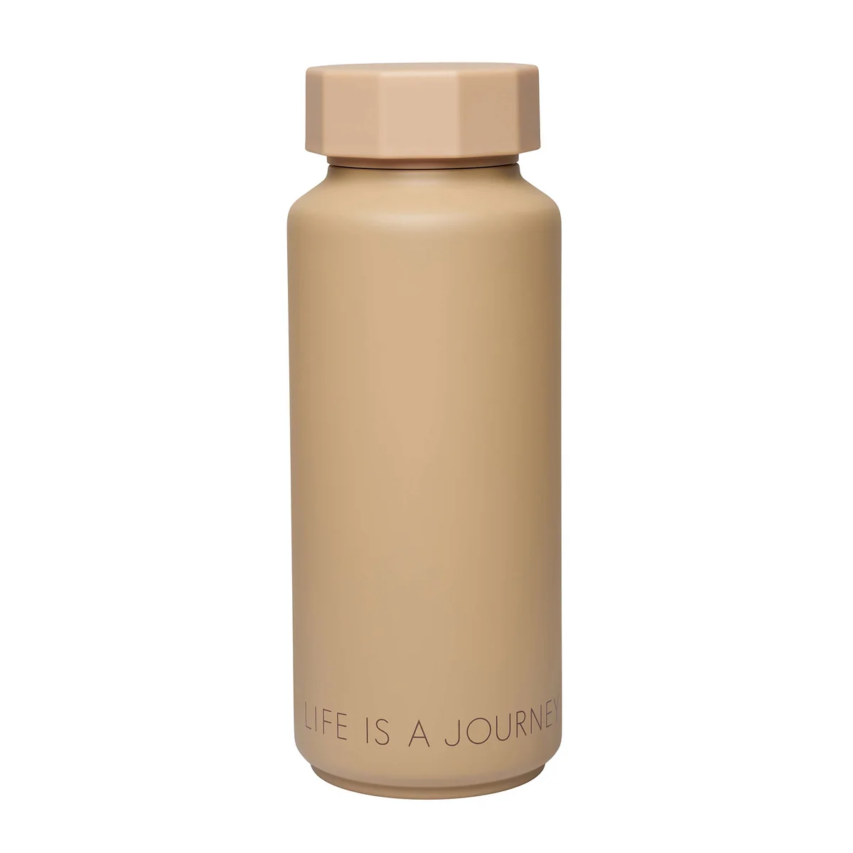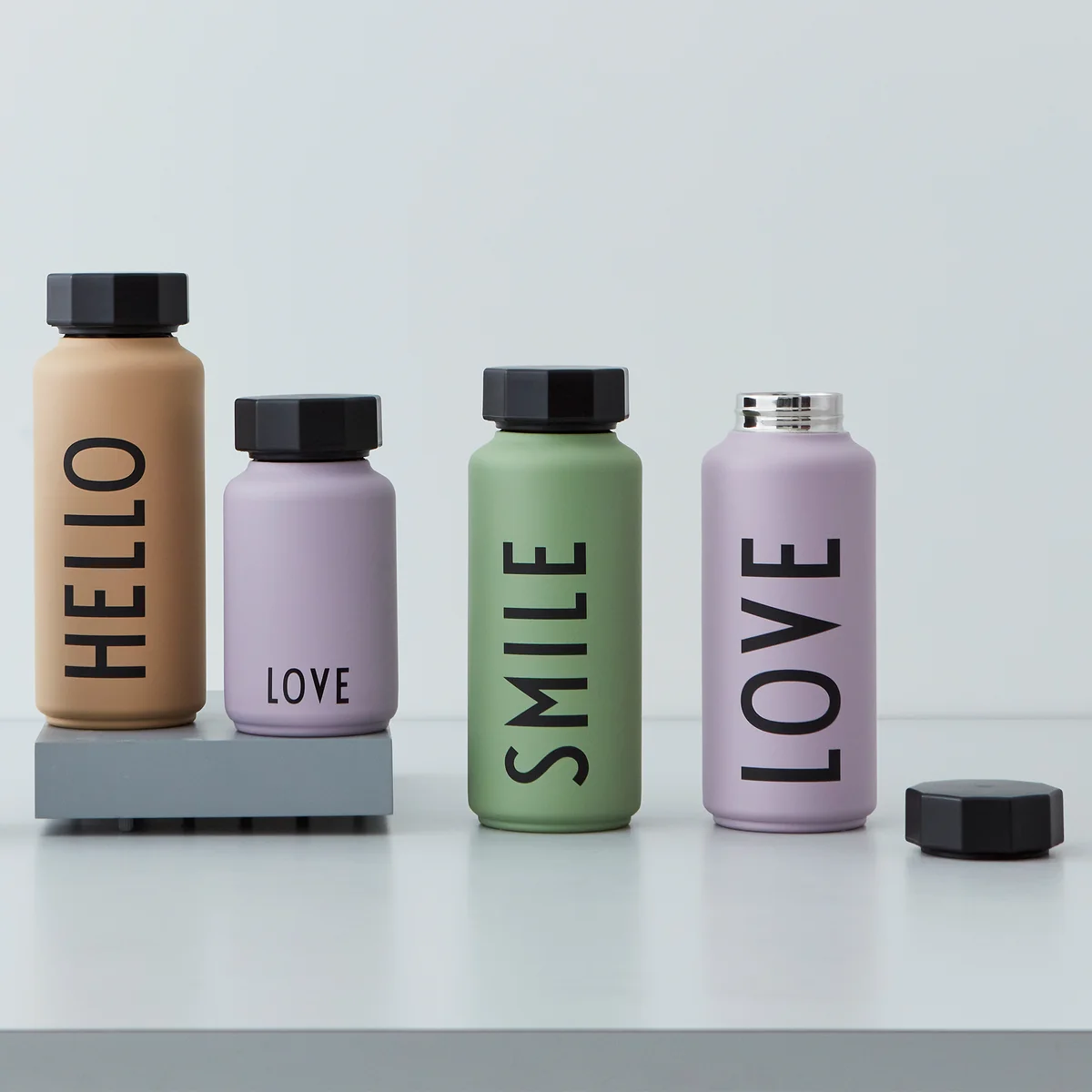 Das Design der Thermosflasche erscheint im stilvollen Retro-Look mit verschiedenen Aufschriften in verschiedenen Farben. Die Typografie stamm von Arne Jacobsen und wurde bereits 1937, ursprünglich zur Beschilderung des Rathauses in Aarhus, entworfen. Das schnörkellose Design hat auch bis heute nichts von seinem Charme verloren und ziert nun unter anderem zahlreiche Produkte von Design Letters.