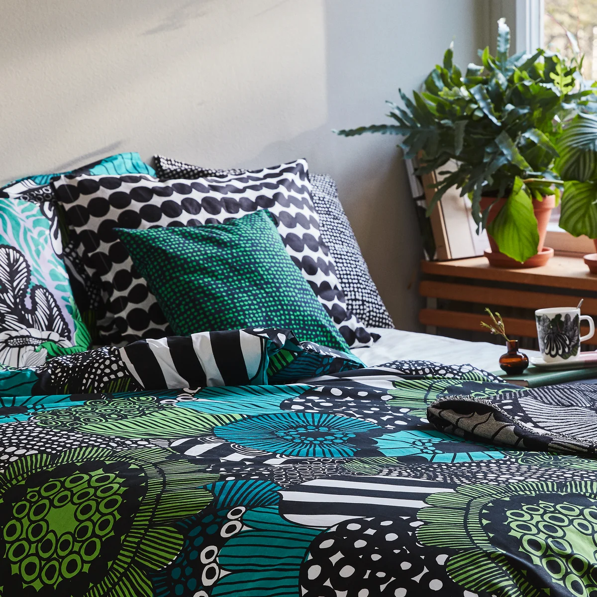 Das Räsymatto Muster von Marimekko stammt von Maija Louekari und besteht aus zahlreichen Kreisen, die rhythmisch aneinandergereiht für ein harmonisches, zeitloses Gesamterscheinungsbild sorgen.