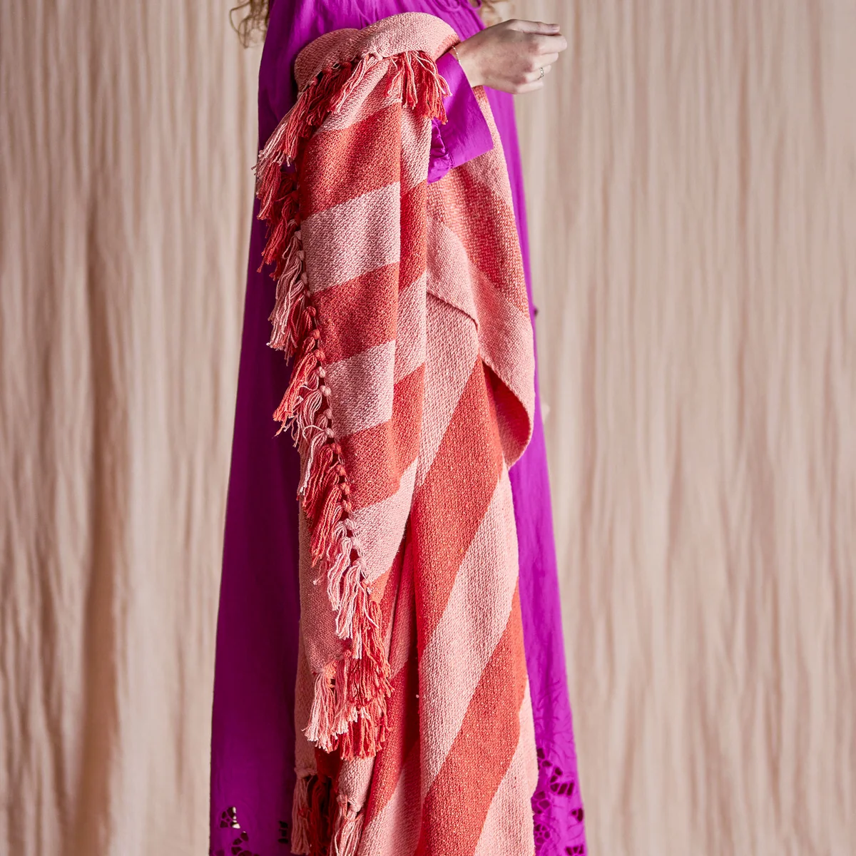 Die Frello Decke überzeugt mit ihrem gewebten Muster in warmen Rottönen und einer besonders weichen Textur. Hergestellt aus recycelter Baumwolle, vereint sie nachhaltige Materialien mit stilvoller Gemütlichkeit. Feine Fransen entlang der Kanten verleihen der Decke eine elegante Note, während sie an kalten Tagen für wohlige Wärme sorgt – perfekt zum Einkuscheln auf dem Sofa oder im Lieblingssessel.