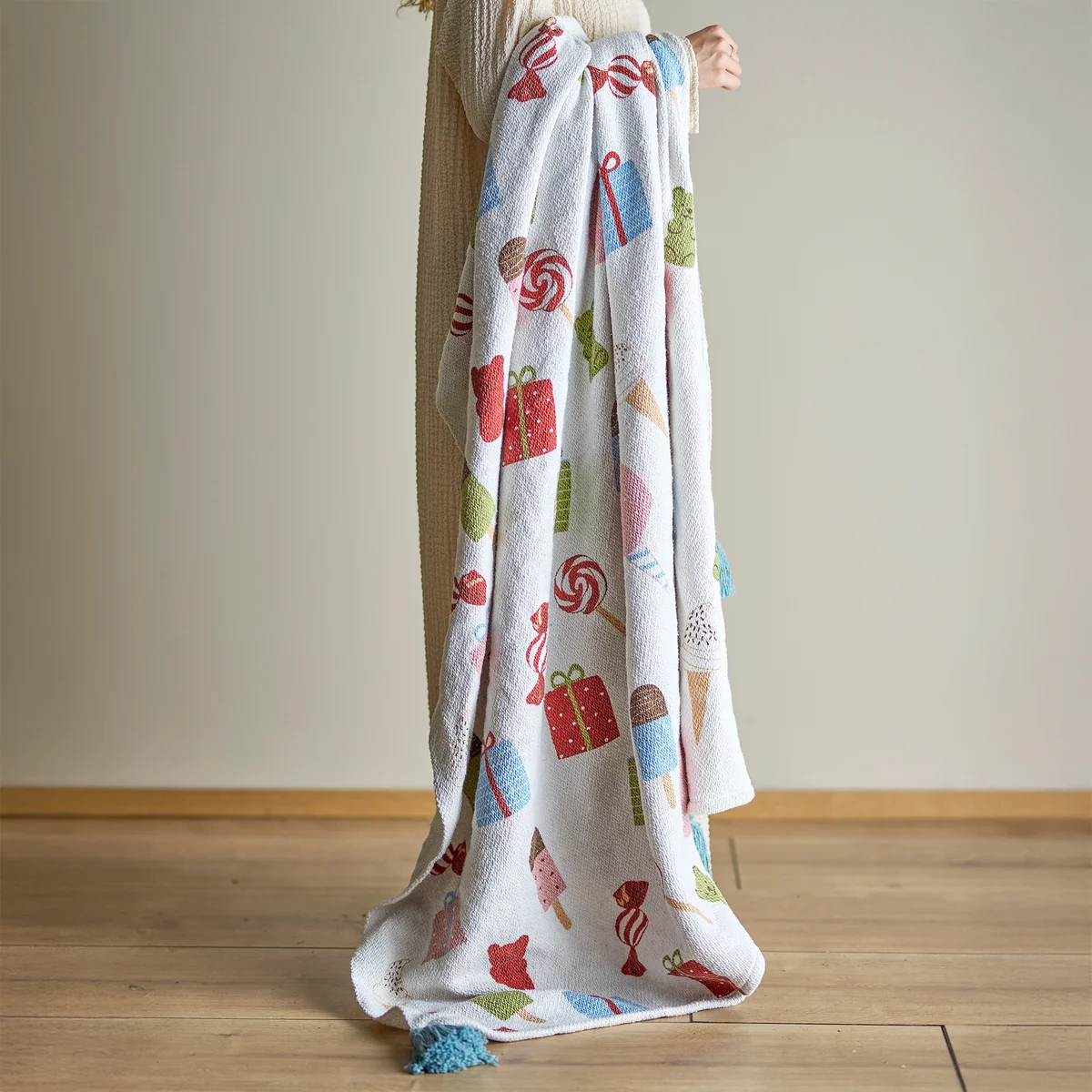Die Sweets Decke von Bloomingville Mini ist ein festlicher Blickfang im Kinderzimmer. Hergestellt aus recycelter Baumwolle, vereint diese kuschelige Decke nachhaltigen Komfort mit einem verspielten Design, das Kinderherzen höherschlagen lässt. Liebevoll gestaltete Illustrationen von Geschenken, Süssigkeiten und Eiscreme zaubern sommerliche Stimmung und laden zu fantasievollen Abenteuern ein. Dekorative Quasten an jeder Ecke verleihen der Decke zusätzlich einen charmanten Akzent und runden das fröhliche Gesamtbild ab. Ob als wärmende Kuscheldecke oder als stimmungsvolles Deko-Element – die Sweets Decke sorgt in jedem Kinderzimmer für eine fröhliche und einladende Atmosphäre.