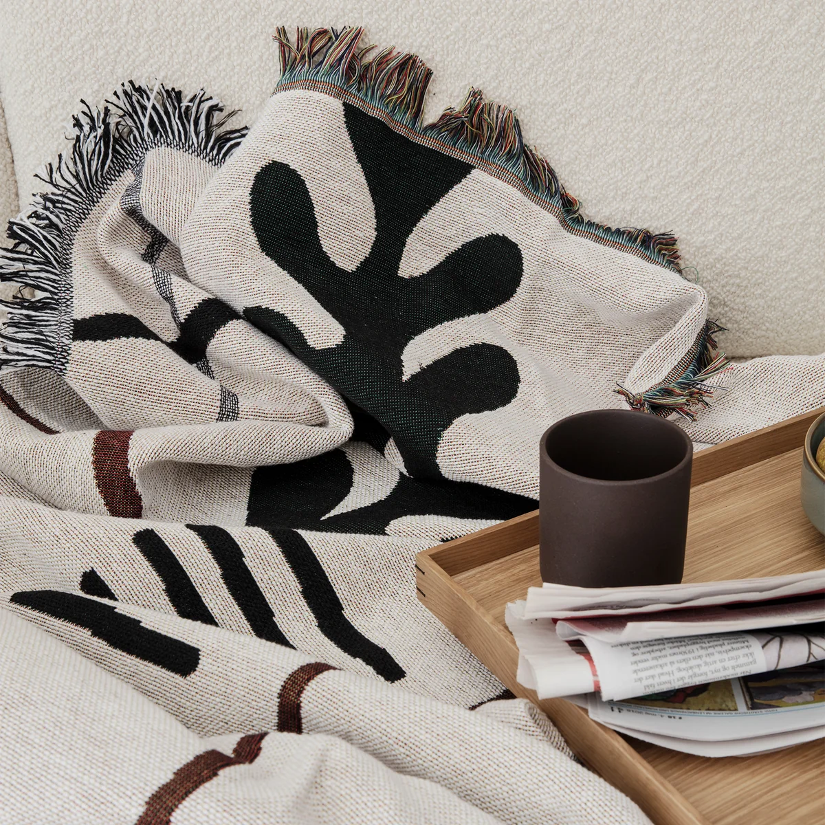 Die Mirage Decke von Ferm Living überzeugt durch Motive von Oasen- und Wüstenparadiesen in abstrakten, modernen Formen. Aus 100 % Baumwolle hergestellt und in den Massen 120 x 170 cm, eignet sich die Decke gut zum Einkuscheln an kalten Tagen auf dem Sofa und macht sich dank der Motive auch toll als Überwurf auf dem Bett oder über dem Sessel. Die Fransen an allen Seiten sorgen für ein verspieltes Detail. Die Decke ist bei 30 °C in der Waschmaschine zu reinigen.