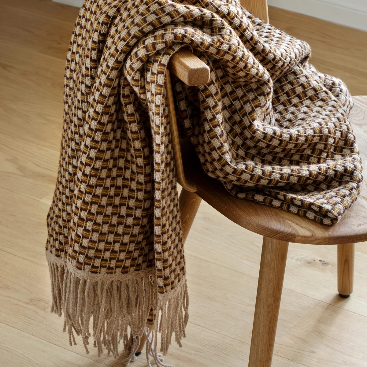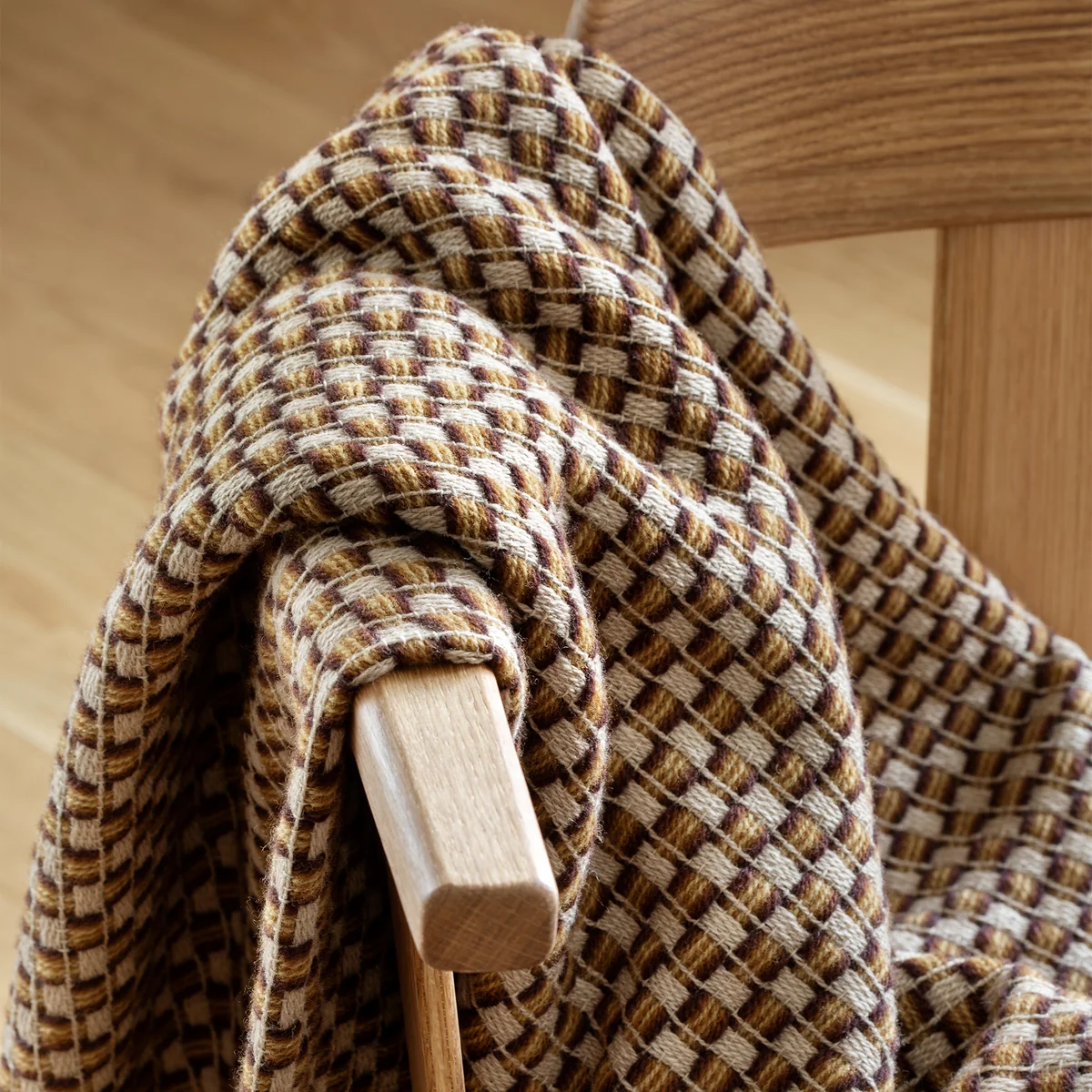 Die Isak Wolldecke des norwegischen Herstellers Røros Tweed erinnert mit seiner geflochtenen Optik an Sitze klassischer Shaker Stühle. Das Muster der Isak Decke der Designer Anderssen & Voll entstand 2016 und war Teil des Forschungsprojekts "Furnishing Uptopia." Austragungsort des Workshops war die Hancock Shaker Village in den USA, welche mit ihren ikonischen Shaker Stühlen als Inspirationsquelle fungierte. Ziel des Designstudios war es die die Optik der bunt gewebten Baumwollbänder der klassischen Stühle innerhalb einer dekorativen Decke umzusetzen.