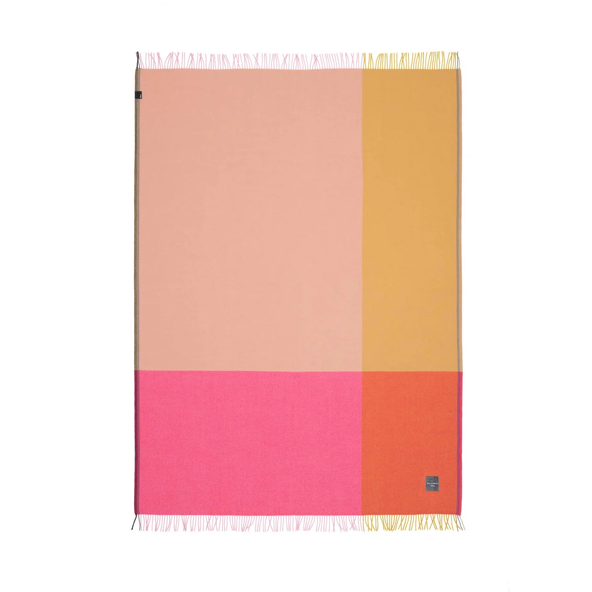 Mit den Colour Block Blankets zeigt die niederländische Designerin Hella Jongerius exemplarisch auf, welchen Effekt die Komposition von Kett- und Schussfaden im Webverfahren auf die Farbzusammenstellung hat. Vier farblich mehr oder weniger intensiv kontrastierende Felder formen im Zusammenspiel ein dekoratives Gesamtmuster. Die jeweilige Mischung der zwei Fadenfarben lässt sich an den Rändern der Decken ablesen: Auf der kurzen Seite an den Farben der Fransen, auf der langen Seite an derjenigen des abgesteppten Randes.