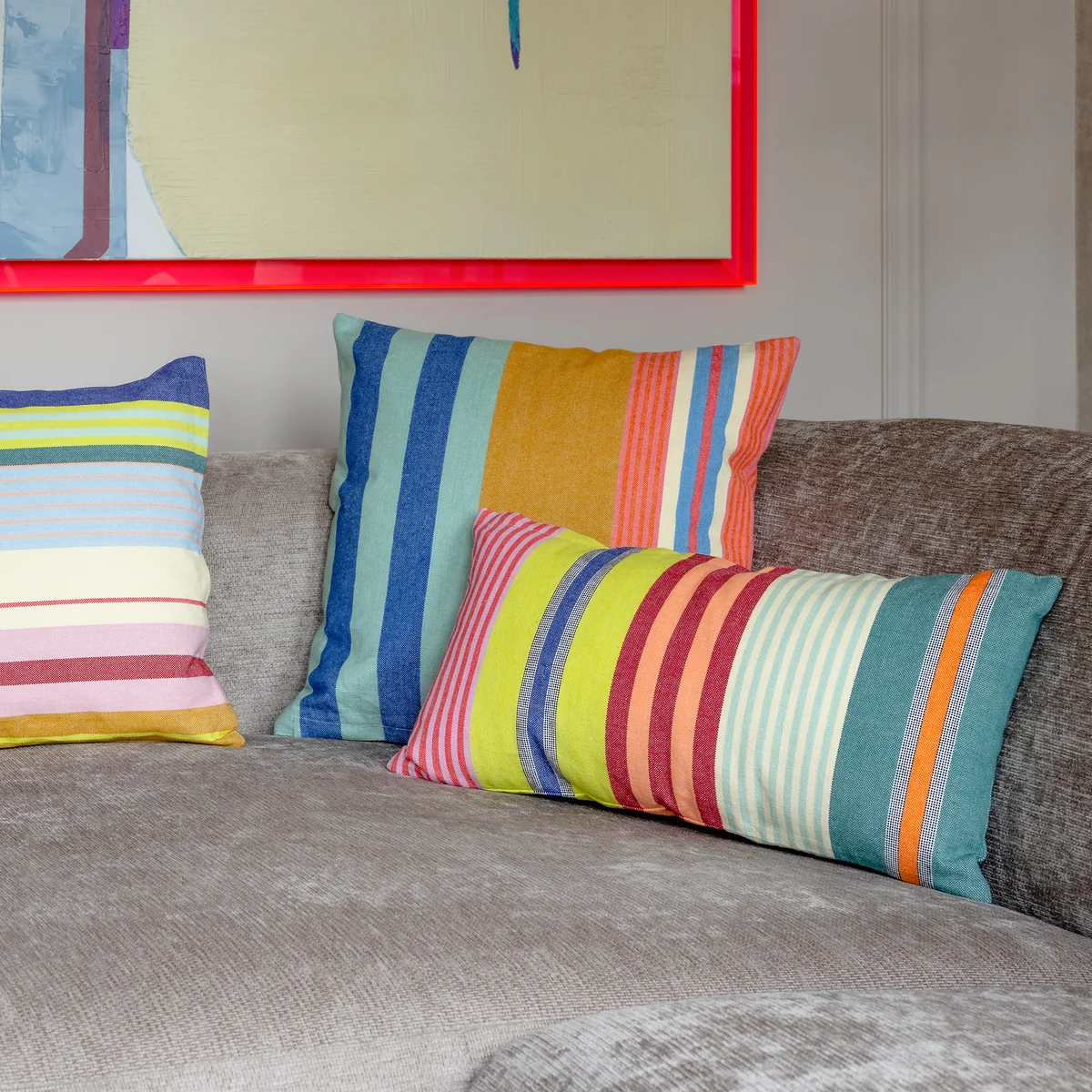 Das Baumwoll-Kissen von Remember verleiht mit seinem bunten Streifenmuster jedem Zuhause einen warmen Touch. Jedes Kissen von Remember ist ein echter Hingucker und trotzt mit seinem farbenfrohen Bezug jeder trüben Laune und jedem schlechten Wetter.