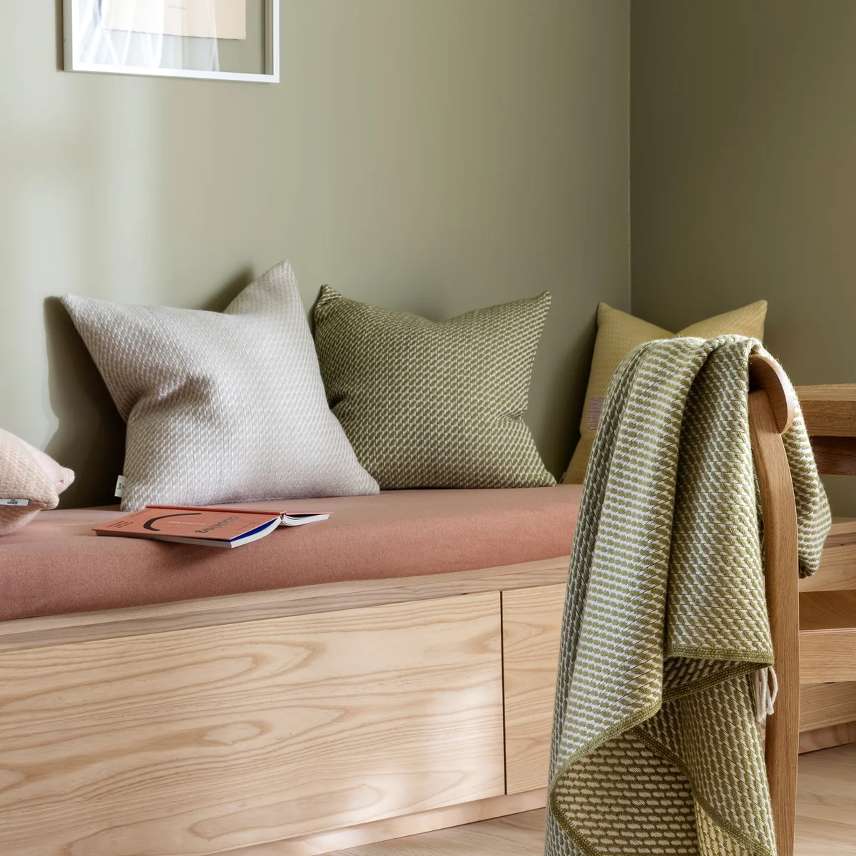 Das Mello Kissen von Skogstad & Wærnes für Røros Tweed. Das in der letzten Saison eingeführte Mello-Design wird nun um eine Reihe von Kissen erweitert, die in denselben Farben wie die bestehenden Überwürfe erhältlich sind. Skogstad & Wærnes experimentierte mit Garn und Papier, um ein diagonales Muster zu erzeugen. Das Ergebnis ist eine strukturell belastbare Konstruktion, die dem Stoff eine dreidimensionale Textur verleiht.