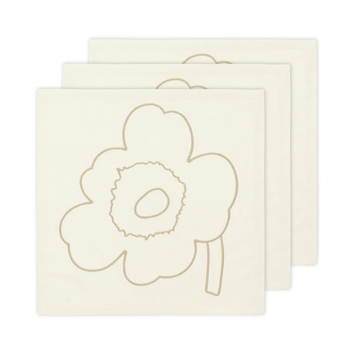 Die Piirto Unikko Satin Servietten vom Marimekko bestehen aus ungebleichtem Baumwollsatin. Jede Serviette zeigt die gestickte Piirto Unikko Blume in der Mitte und ist mit genähten Rändern versehen.