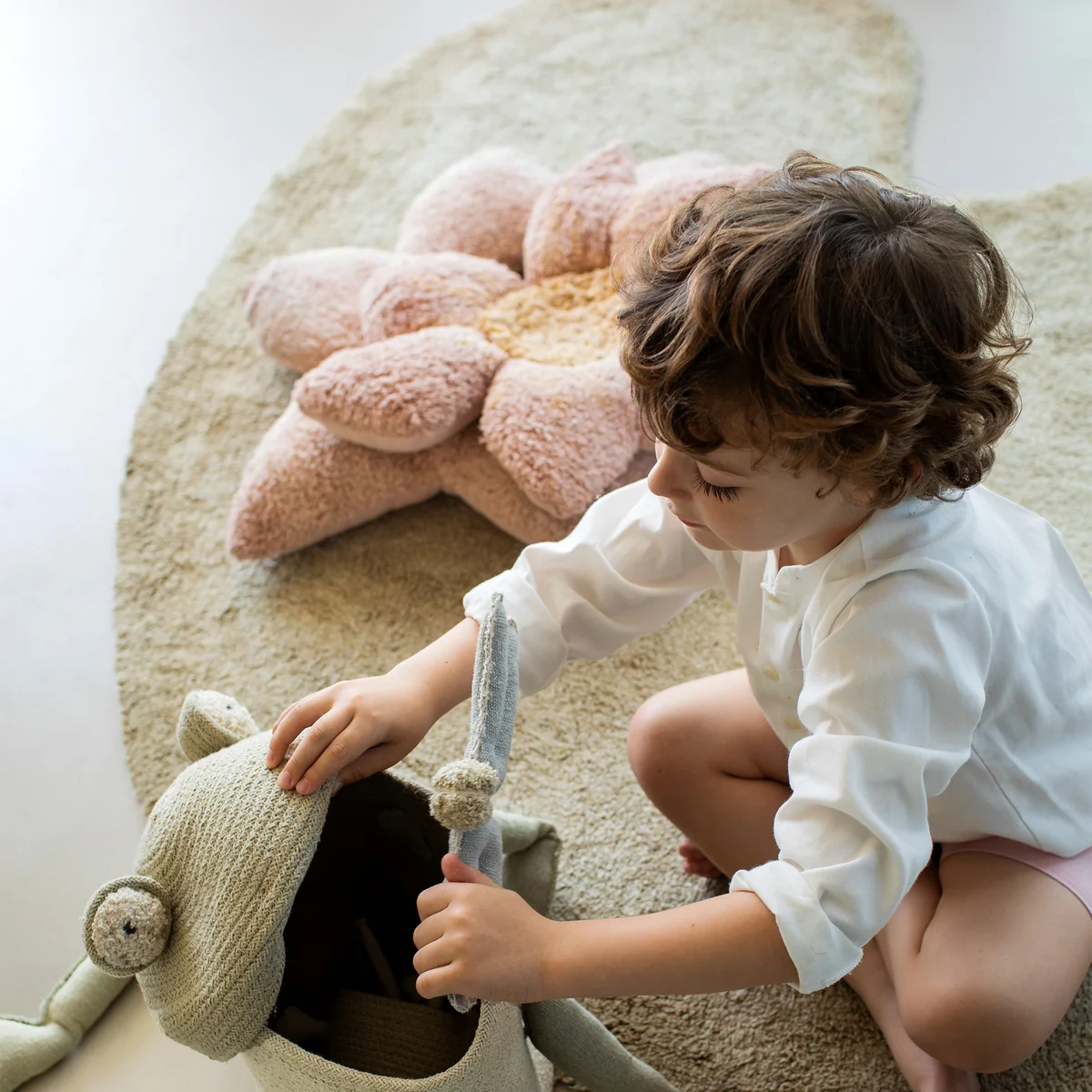 Der Puffy Lily Teppich aus dem Hause Lorena Canals begeistert mit seiner wunderbaren Multifunktionalität. Puffy Lily ist ein Teppich und Kissen zugleich. Die Seerosen-Form verleiht einen frischen Touch. Das blumenförmige Kissen lässt sich bei Bedarf abnehmen. Puffy Lily wird aus Baumwolle und recycelten Fasern gefertigt. Das Kissen wird mit Polyester befüllt.