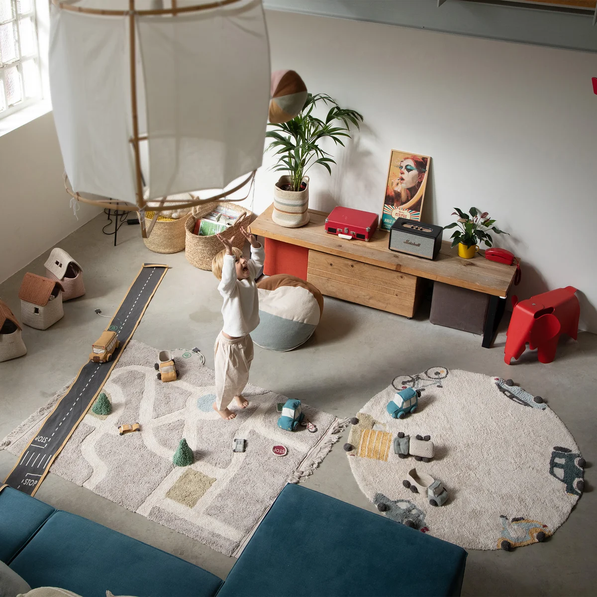 Der Wheels Teppich aus dem Hause Lorena Canals bietet maximalen Spass in der Eco-City. Die kleinsten Familienmitglieder können ihrer Fantasie freien Lauf lassen. Der Teppich mit e-Fahrzeugen und Fahrrädern kann wunderbar im gesamten Haus platziert und transportiert werden. Wheels wird aus einer Baumwoll-Basis mit recycelten Textilfasern gefertigt.