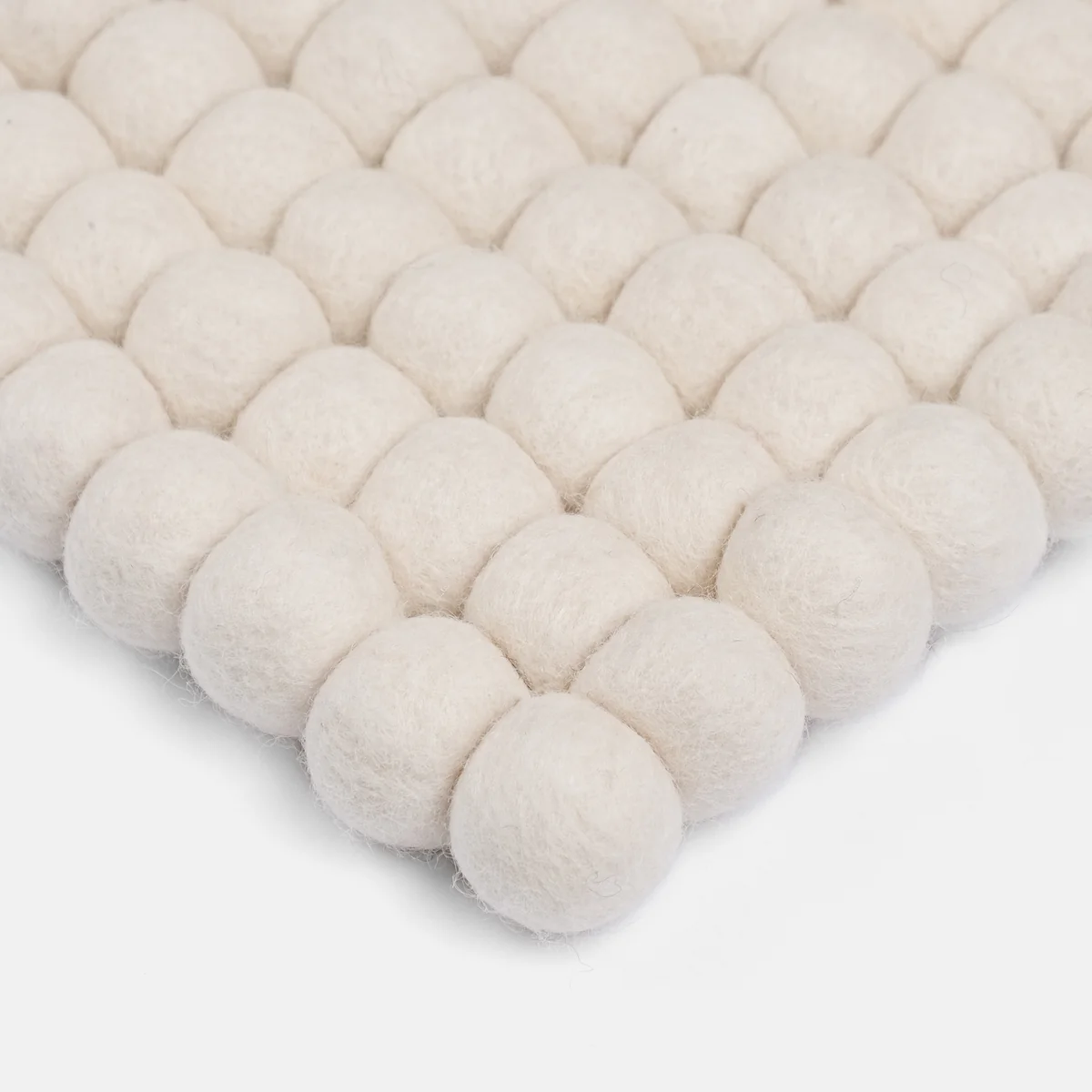 Die Teppiche von myfelt bestehen zu 100% aus neuseeländischer Schurwolle, die zu den hochwertigsten der Welt gehört. In der Teppichmanufaktur in Nepal wird die unbehandelte Wolle gekämmt und mehrmals gewaschen. Danach wird die Wolle in der entsprechenden Farbe in der von „Label STEP®“ Fair Trade zertifizierte Färberei nach rein ökologischen Richtlinien eingefärbt. Das anschliessende Filzen ist der aufwendigste Arbeitsschritt. In Handarbeit wird jede einzelne Kugel durch mehrere Arbeitsschritte in ihre endgültige Form gebracht. Danach werden die fertigen Kugeln mit einem speziell von myfelt entwickelten Knüpfverfahren zu einem Teppich vernäht. Dabei kann ein Teppich aus bis zu 50.000 Filzbällen bestehen.