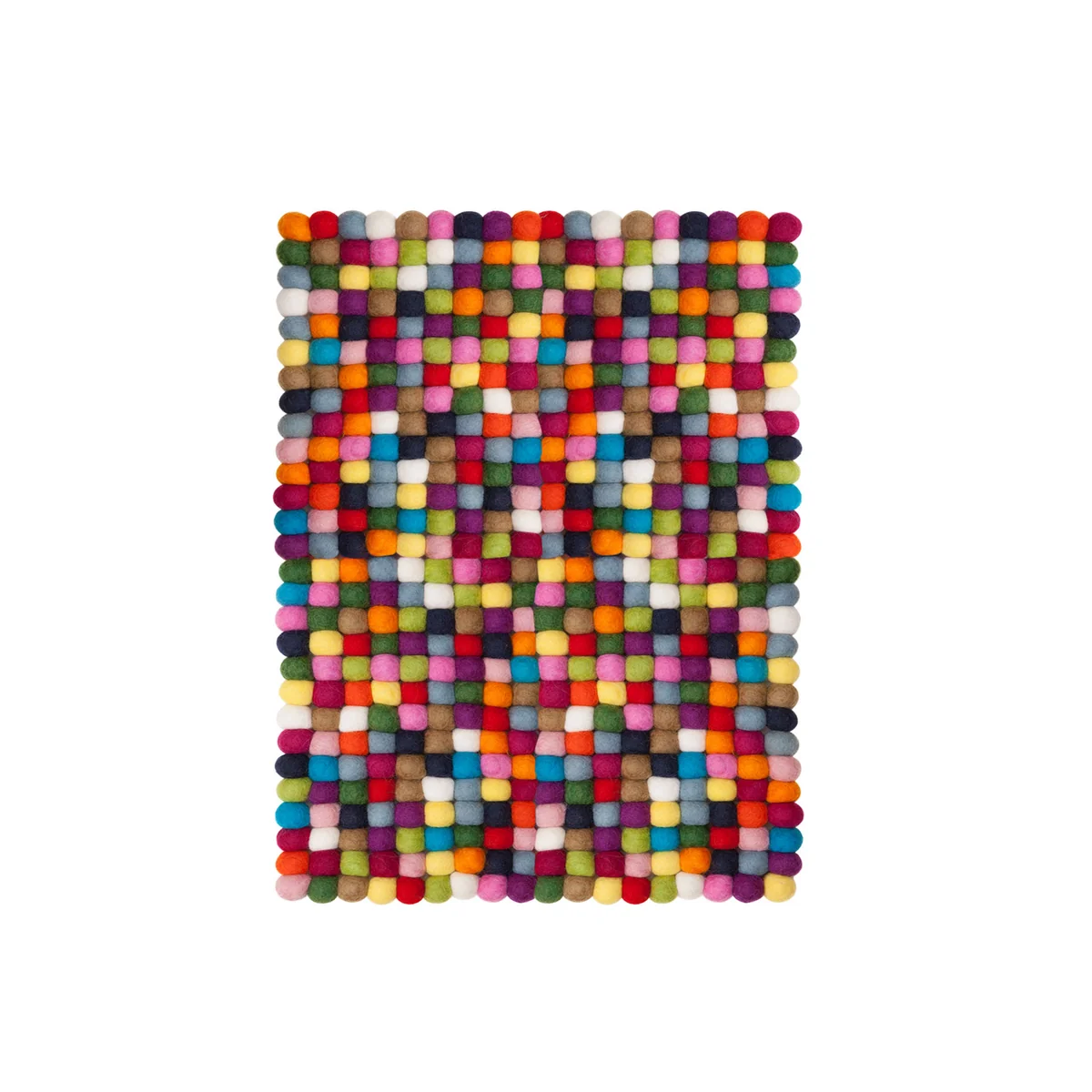 Der rechteckige Filzkugelteppich von myfelt ist kunterbunt und fällt sofort ins Auge. Seine, bunt eingefärbten Filzbälle ziehen alle Blicke auf sich und bringen Freude in jeden Raum. Egal, ob Wohn- oder Kinderzimmer.