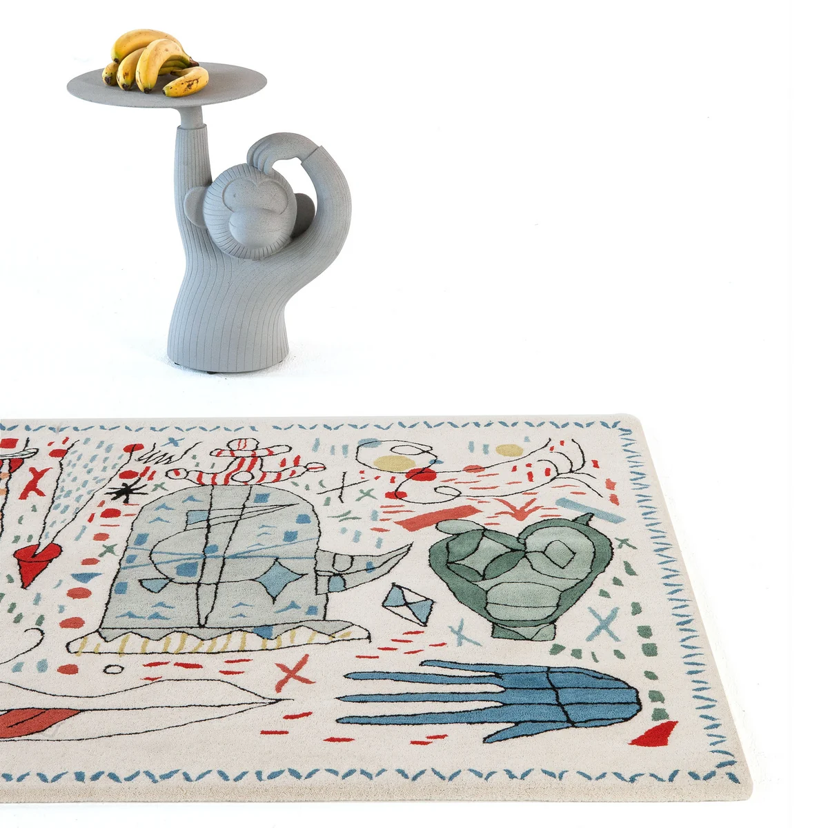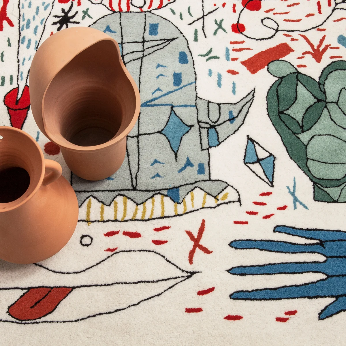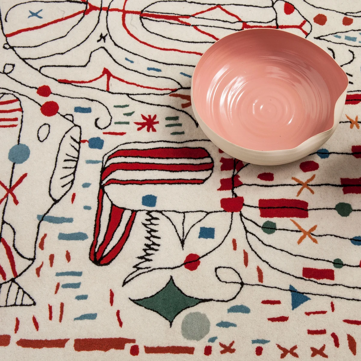 Basierend auf den Zeichnungen von Designer Jaime Hayon werden die Teppiche handgetuftet. Dabei werden manuell mit einer Teppichpistole Wollelemente ergänzt, um intuitive und flüssige Linien sowie eine organische Komposition zu erreichen.