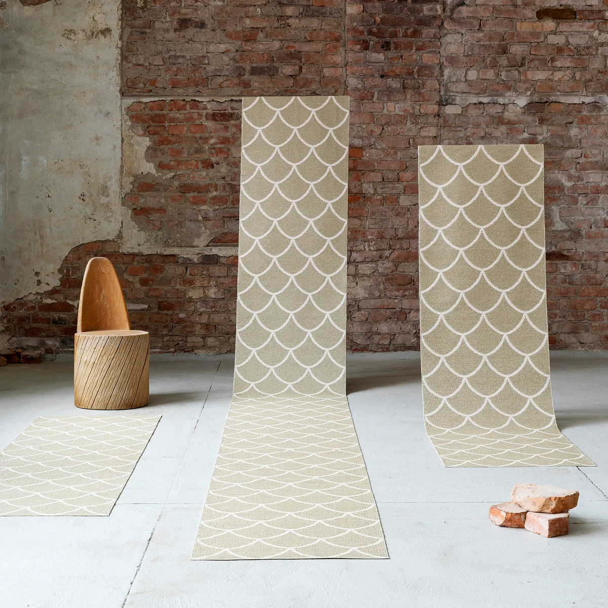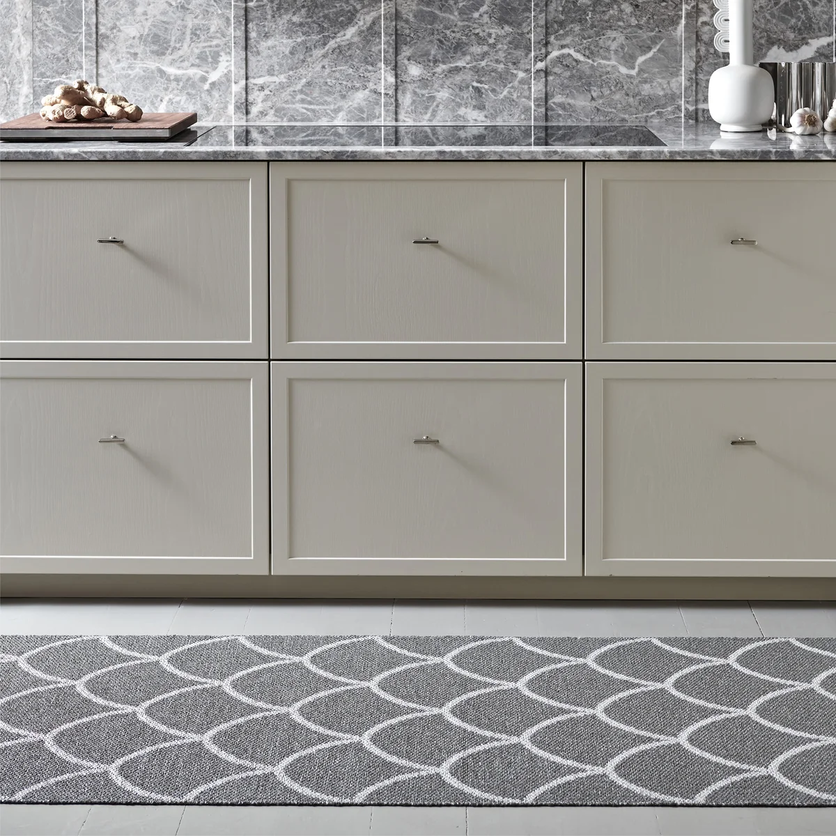 Der Kotte Wendeteppich von Pappelina ist ein aus Kunststoff hergestellter Läufer für den Innen- und Aussenbereich. Seine unterschiedlich farbigen Seiten ziert ein dezentes Fischschuppen-Muster - beides sorgt für stilvolle Akzente auf dem Boden in der Küche, dem Flur oder dem Balkon. Auch das Prägelogo an beiden Enden verleiht ihm einen hochwertigen Look.